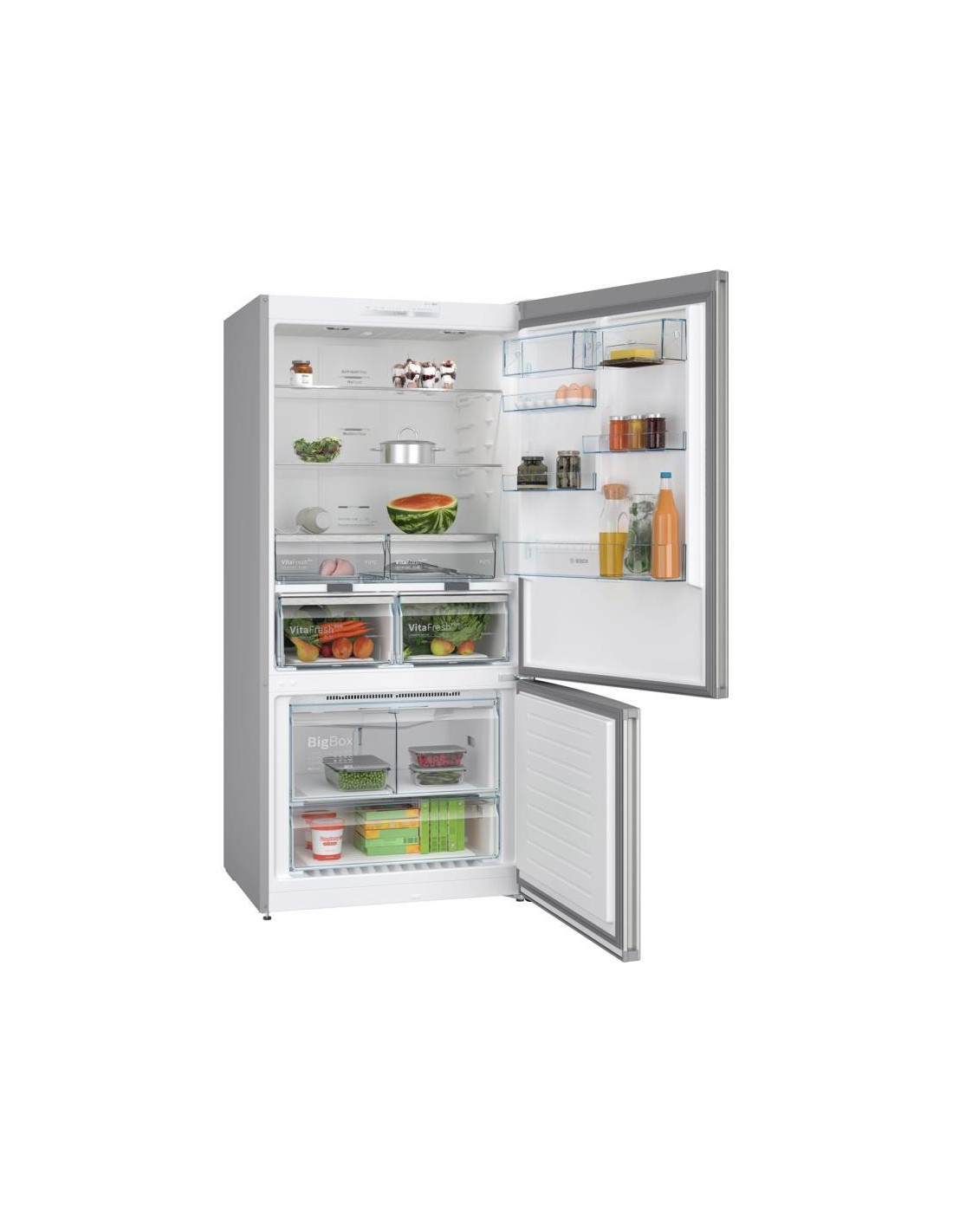 Bosch Serie 4 KGN86VIEA. Capacidade total líquida: 631 l. Dobradiça da porta: Direita. Classe climática: SN-T, Nível de ruído: 40 dB. Capacidade líquida do frigorífico: 479 l, Sistema no-frost (frigorífico), Sistema multi-airflow (frigorífico), Luz interior do frigorífico. Capacidade líquida do congelador: 152 l, Capacidade de congelação: 10 kg/24h, Sistema no-frost (congelador ). Compartimento de zona fresca. Classe de eficiência energética: E, Consumo de energia anual: 307 kWh. Cor do produto: Aço inoxidável ;