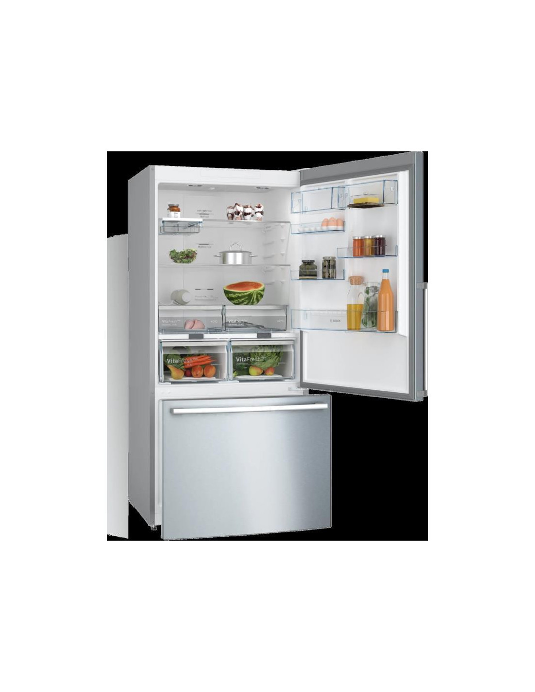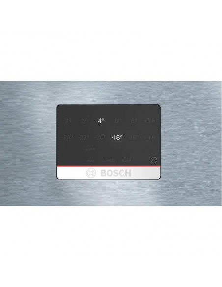 Bosch Serie 6 KGB86XIEP. Capacidade total líquida: 631 l. Dobradiça da porta: Direita, Tipo de monitor: LCD. Classe climática: SN-T, Nível de ruído: 40 dB. Capacidade líquida do frigorífico: 479 l, Sistema no-frost (frigorífico), Prateleiras do frigorífico: 3. Capacidade líquida do congelador: 152 l, Capacidade de congelação: 15 kg/24h, Sistema no-frost (congelador). Compartimento de zona fresca. Classe de eficiência energética: E, Consumo de energia anual: 307 kWh. Cor do produto: Aço inoxidável ;