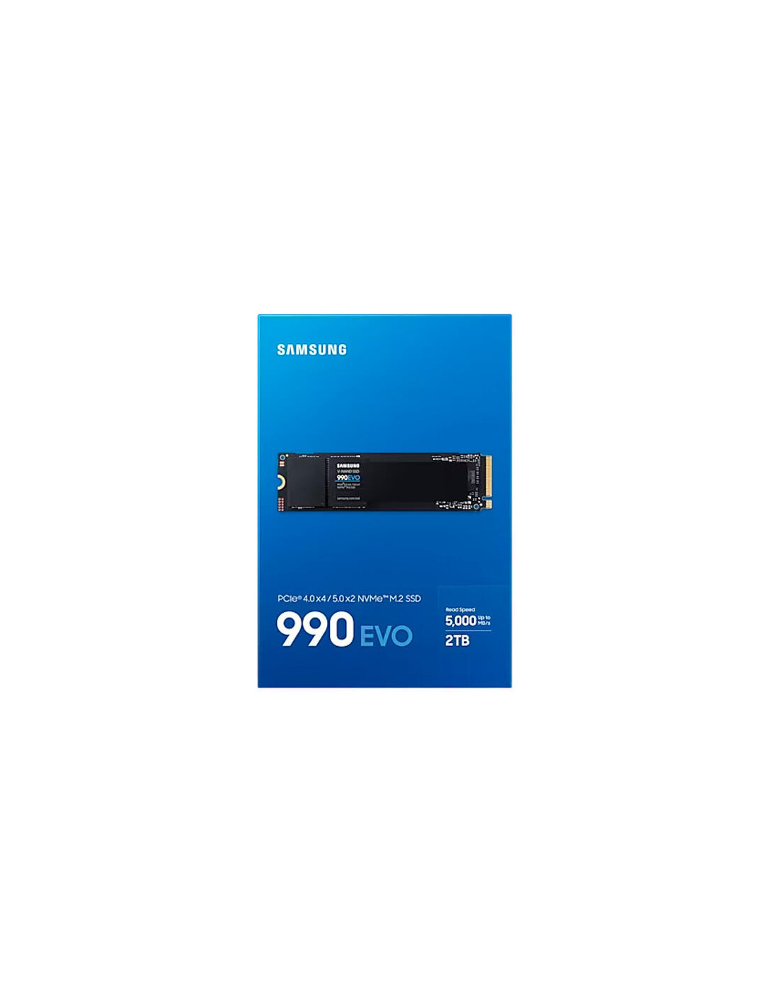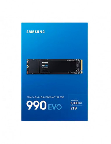 Disco SSD Samsung 990 EVO com capacidade de 2TB, interface NVMe e fator de forma M.2. Oferece velocidades de leitura de até 7300 MB/s e velocidades de escrita sequenciais de até 5500 MB/s. Ideal para computadores, workstations e outros dispositivos que exigem alto desempenho e tempos de resposta rápidos.