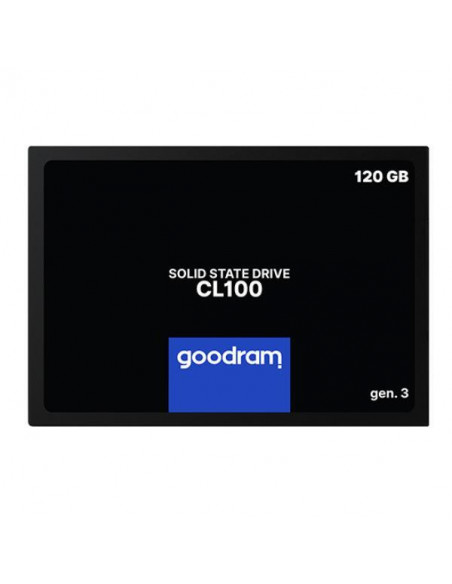 Disco SSD interno Goodram CL100 com 120 GB de capacidade, interface SATA III, velocidade de leitura até 500 MB/s e velocidade de escrita até 360 MB/s. Formato 2,5". Garantia de 36 meses. EAN: 5908267923399