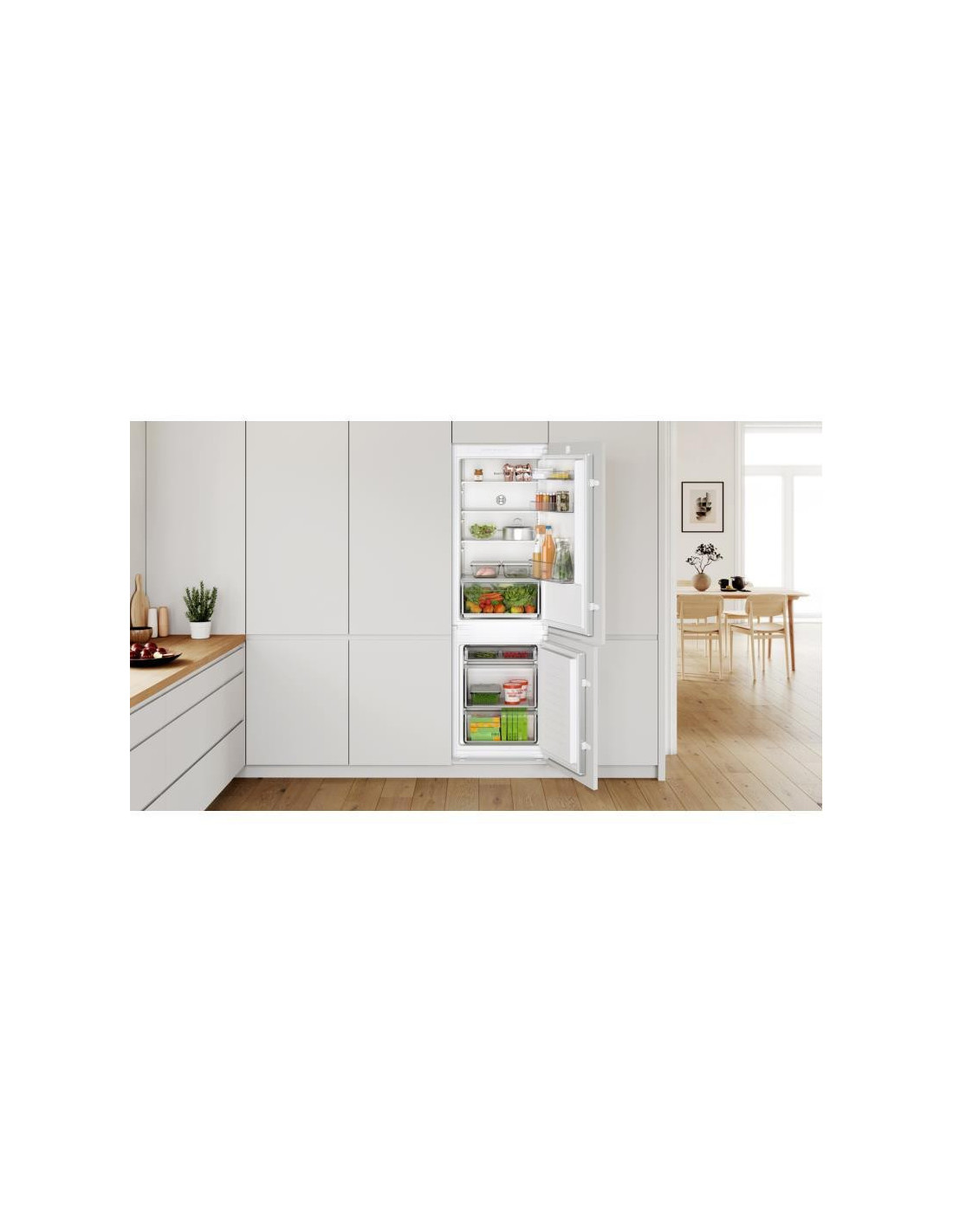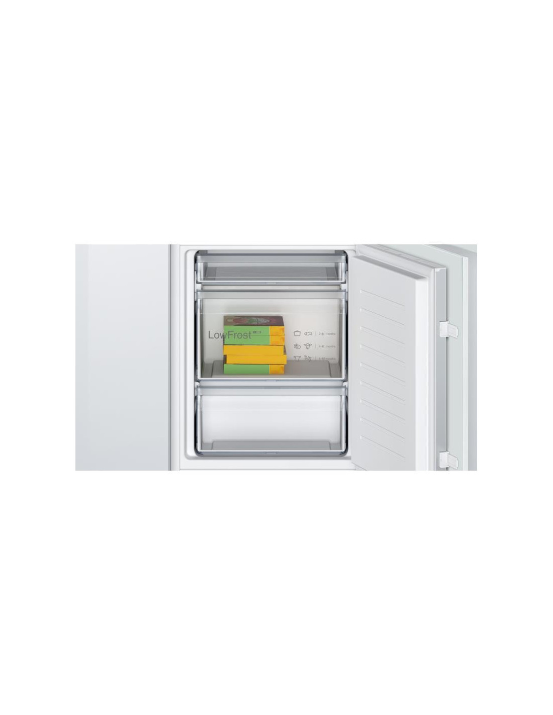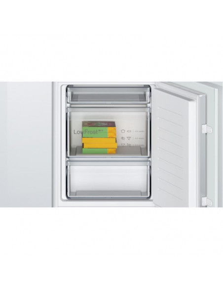 Bosch Serie 2 KIV86NSE0. Capacidade total líquida: 267 l. Dobradiça da porta: Direita. Classe climática: SN-ST, Nível de ruído: 35 dB. Capacidade líquida do frigorífico: 183 l, Sistema multi-airflow (frigorífico), Luz interior do frigorífico, Prateleiras do frigorífico: 4, Número de gavetas para legumes: 1. Capacidade líquida do congelador: 84 l, Capacidade de congelação: 4,2 kg/24h, Sistema no-frost (congelador). Classe de eficiência energética: E, Consumo de energia anual: 229 kWh. Cor do produto: Branco ;