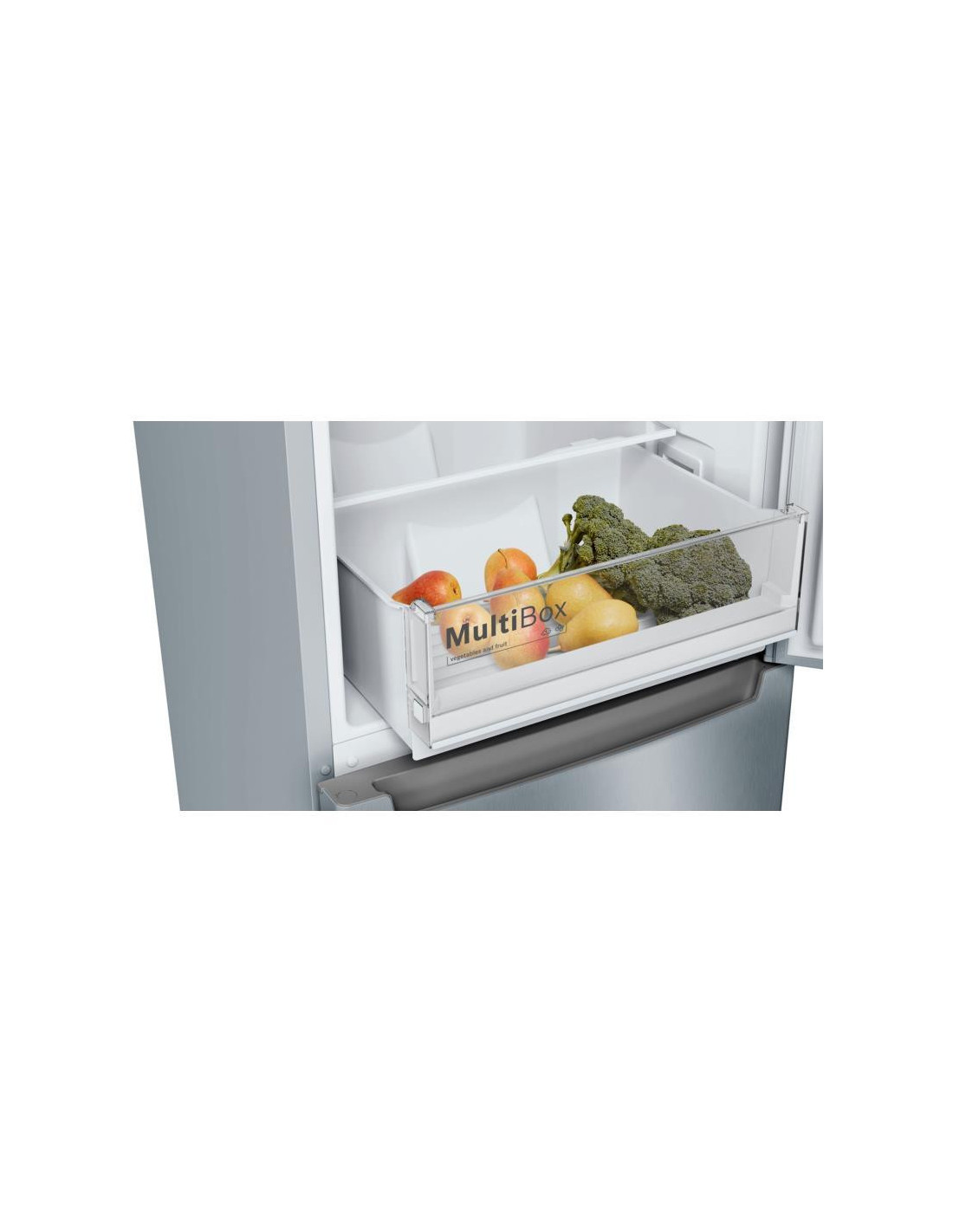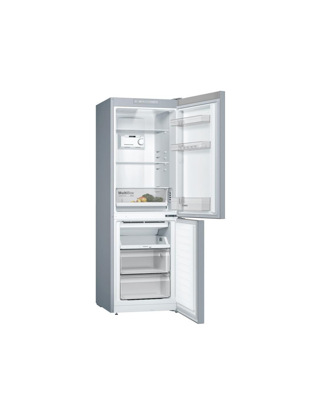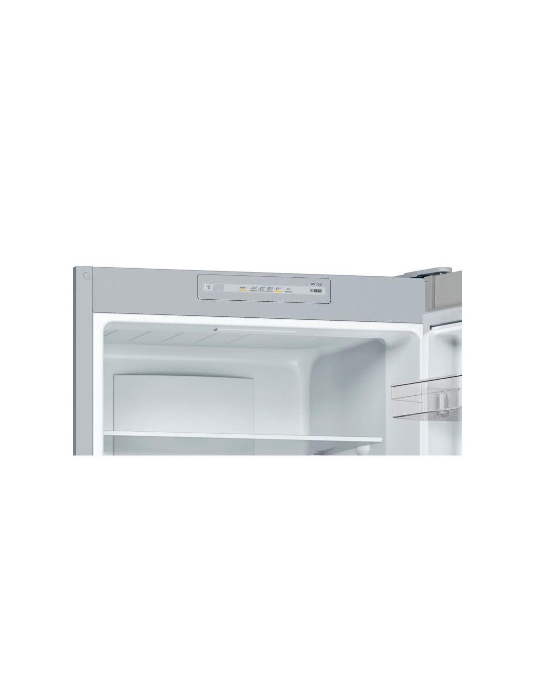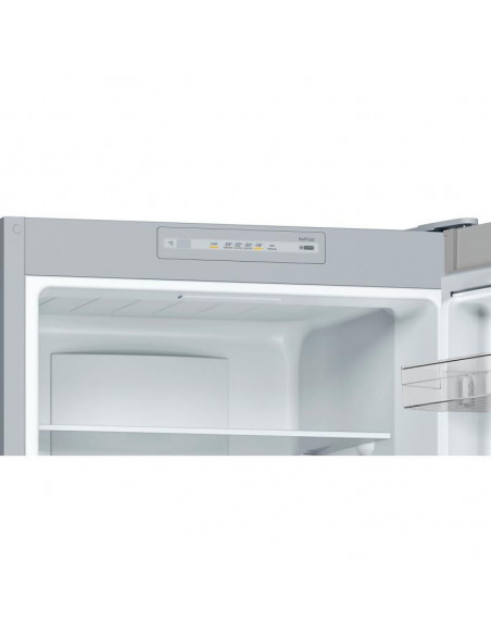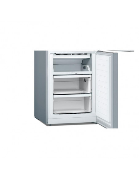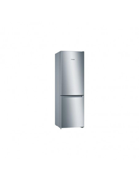 Bosch Serie 2 KGN33NLEB. Capacidade total líquida: 282 l. Dobradiça da porta: Direita, Tipo de monitor: LED. Classe climática : SN-T, Nível de ruído: 42 dB. Capacidade líquida do frigorífico: 193 l, Sistema no-frost (frigorífico), Sistema multi-airflow (frigorífico), Luz interior do frigorífico. Capacidade líquida do congelador: 89 l, Capacidade de congelação: 11 kg/24h. Compartimento de zona fresca. Classe de eficiência energética: E, Consumo de energia anual: 237 kWh. Cor do produto: Aço inoxidável. ;