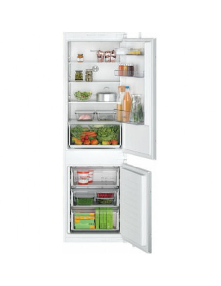 Bosch Serie 2 KIN86NSE0. Capacidade total líquida: 260 l. Dobradiça da porta: Direita. Classe climática: SN-ST, Nível de ruído: 39 dB. Capacidade líquida do frigorífico: 184 l, Sistema no-frost (frigorífico), Luz interior do frigorífico, Prateleiras do frigorífico: 4. Capacidade líquida do congelador: 76 l, Capacidade de congelação: 4 kg/24h, Sistema no-frost (congelador). Compartimento de zona fresca. Classe de eficiência energética: E, Consumo de energia anual: 234 kWh. Cor do produto: Branco