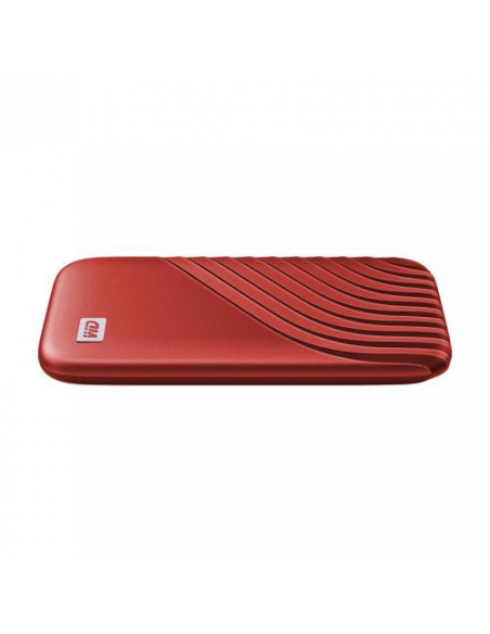 Disco rígido externo SSD SanDisk My Passport de 2TB, na cor vermelha. Oferece velocidades de leitura de 1050 MB/s e velocidades de escrita de 1000 MB/s, assegurando transferências rápidas de ficheiros. Compatível com PC e Mac. Possui proteção por senha e encriptação de hardware para segurança dos seus dados.