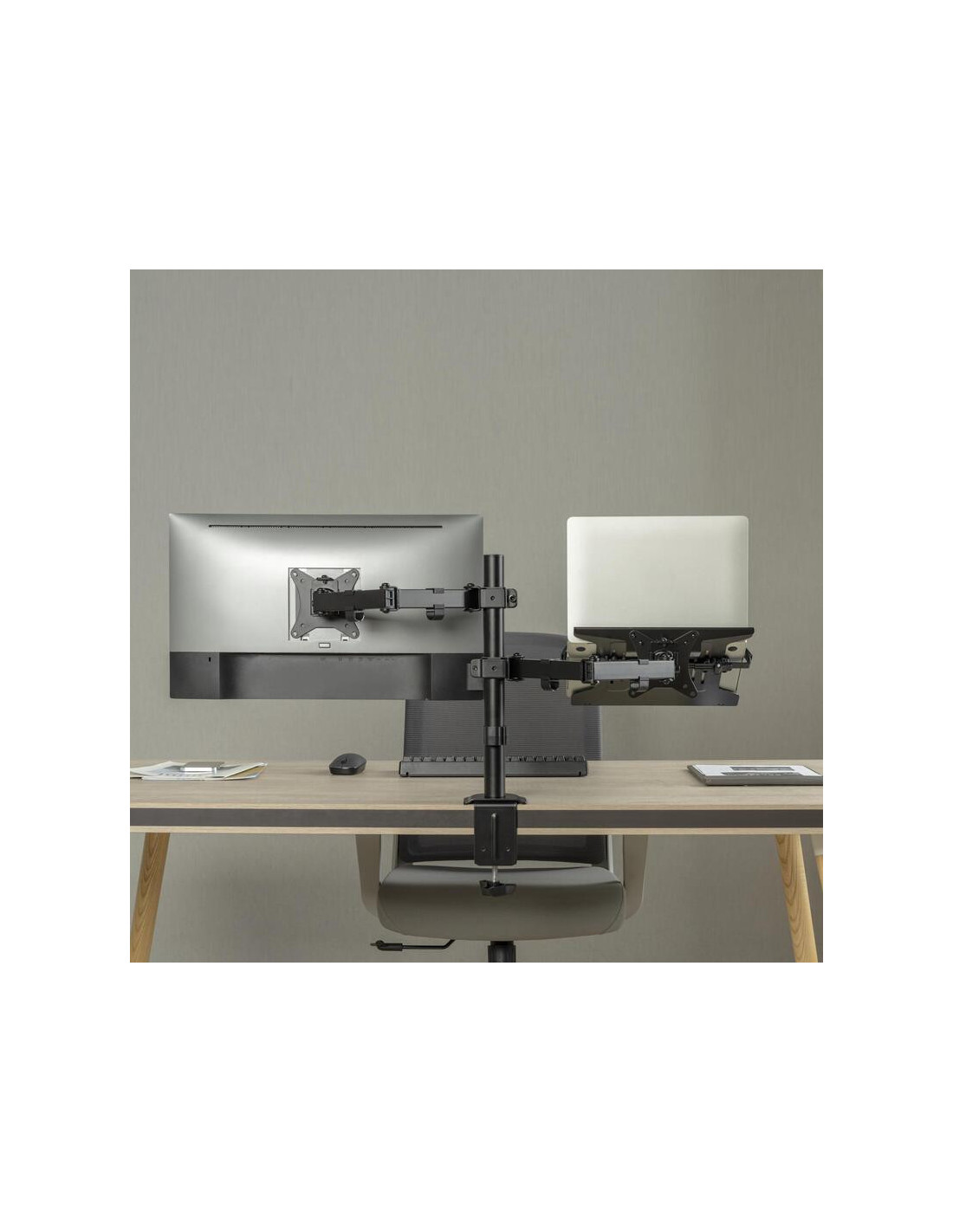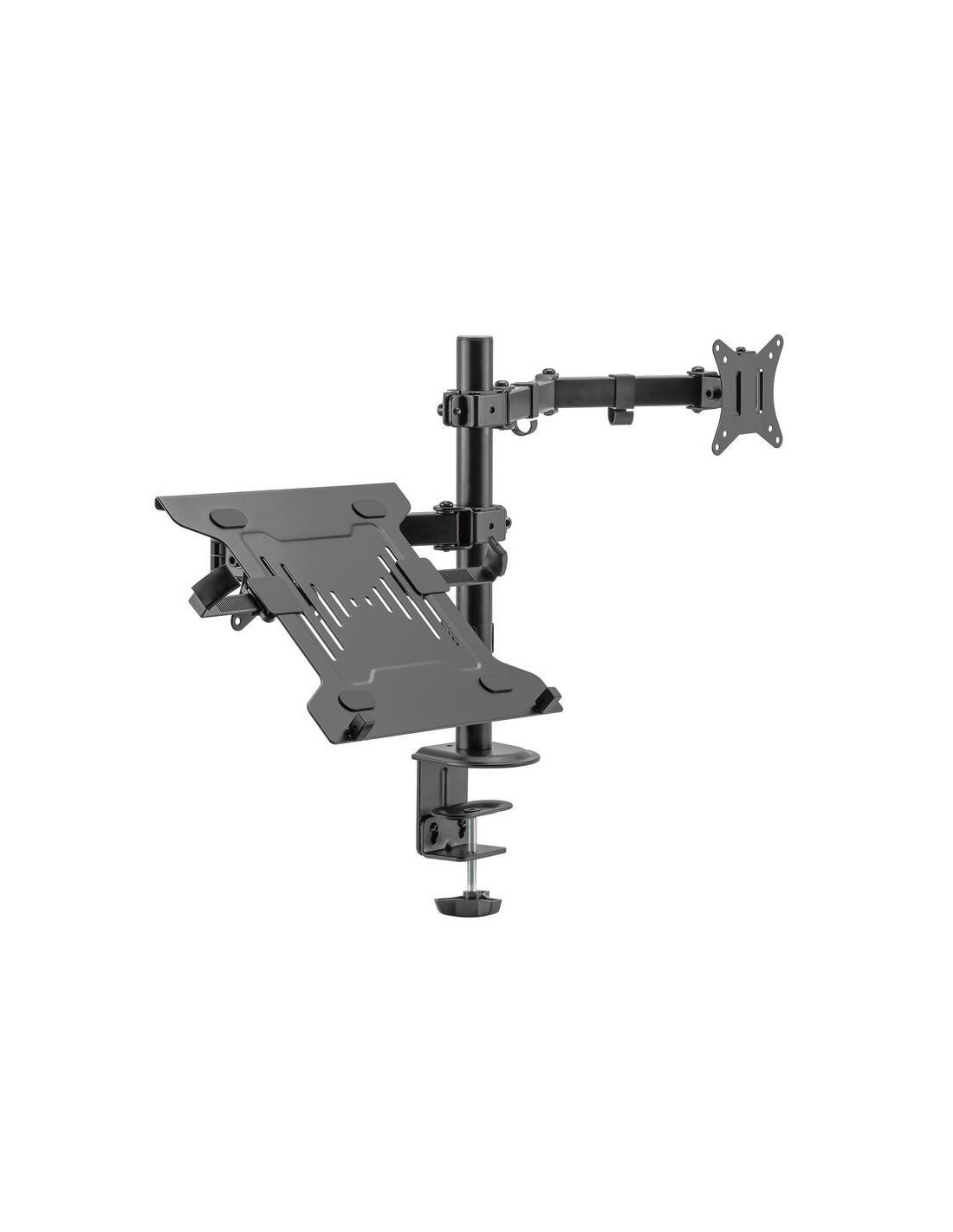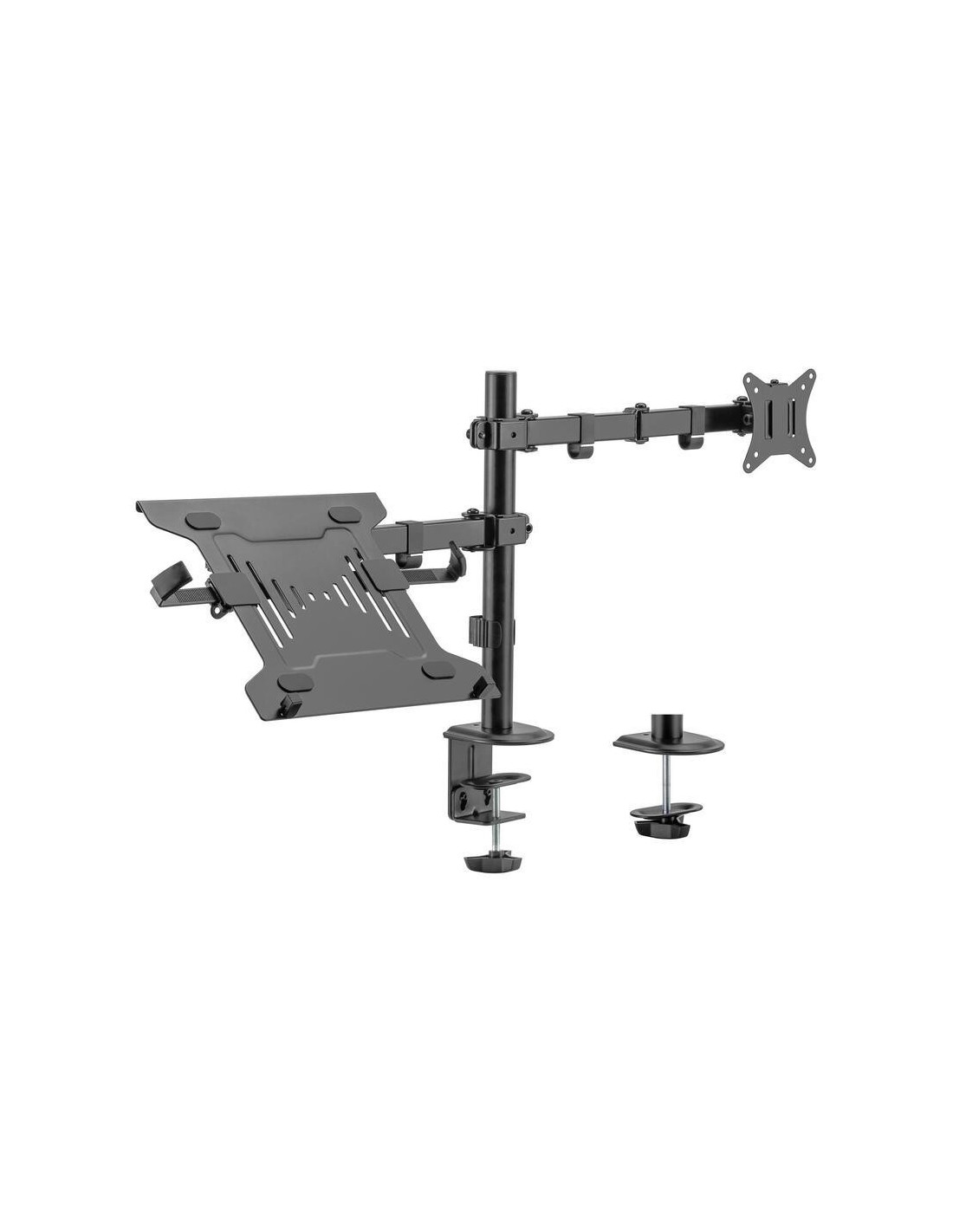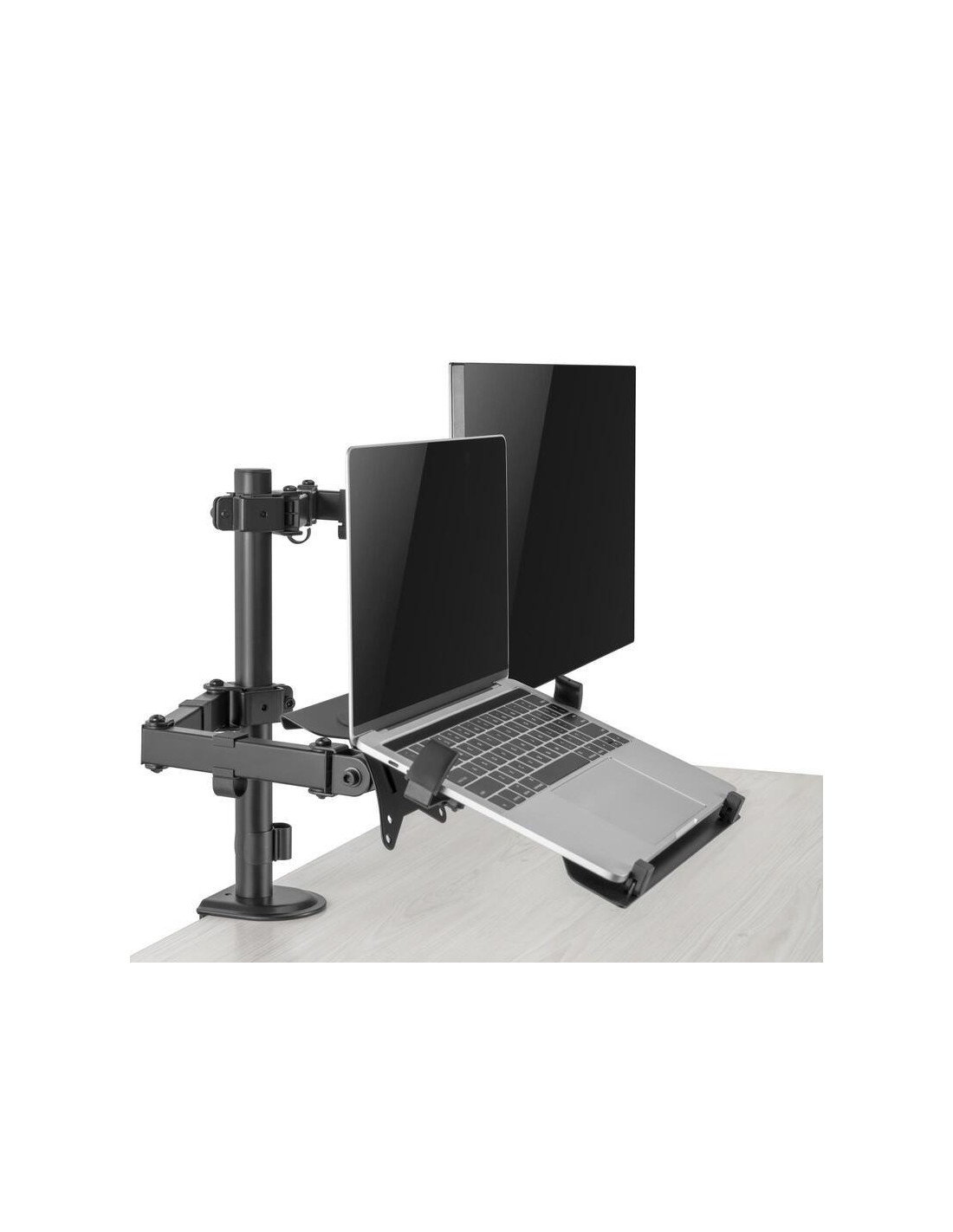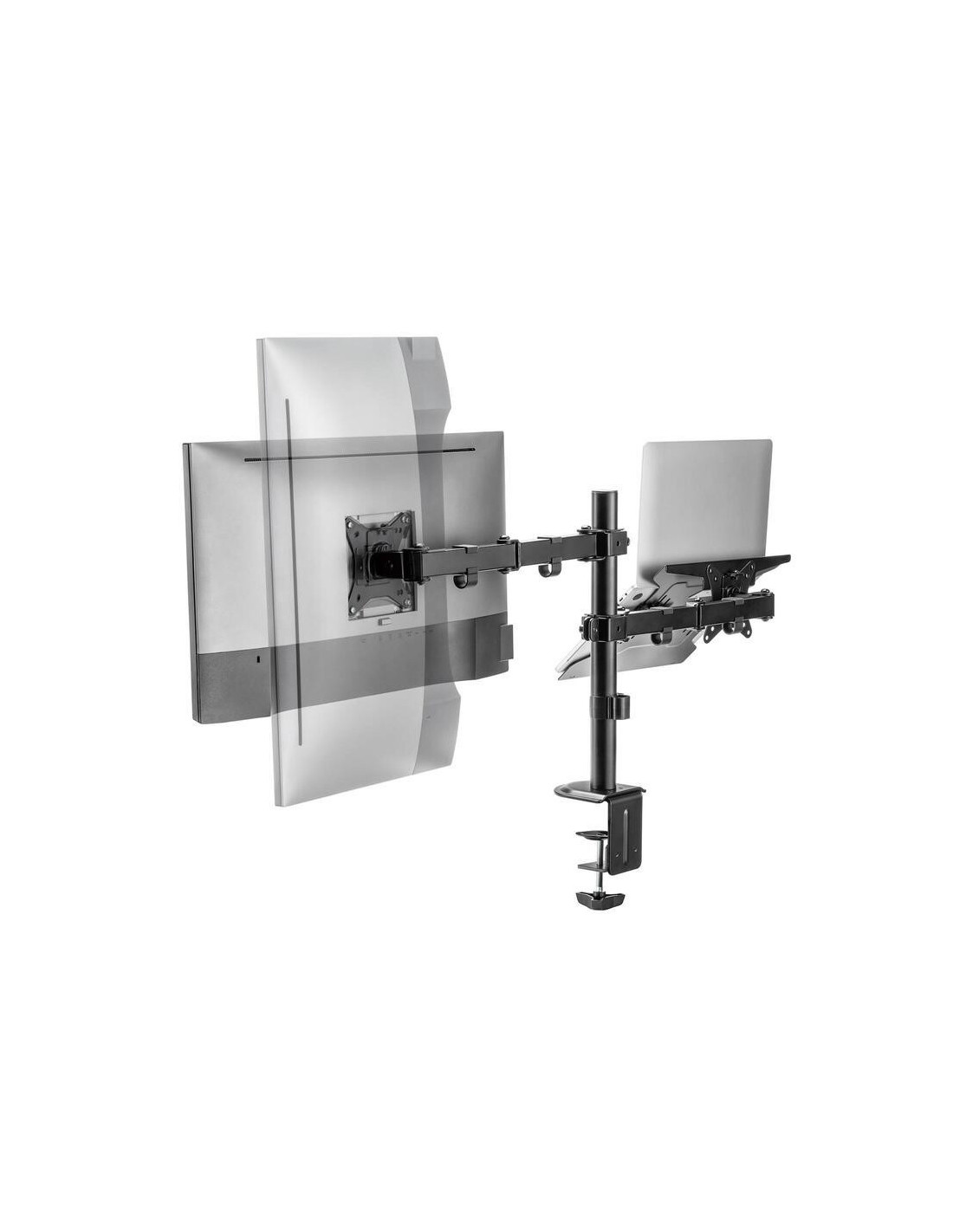 O suporte de monitor Ewent EW1519, com o seu design inteligente, transforma a sua área de trabalho num espaço mais organizado e ergonómico. Este suporte é uma solução versátil, perfeita para quem utiliza tanto um monitor como um portátil no seu dia a dia. O design modular acomoda até 1 monitor e 1 portátil, eliminando a necessidade de múltiplos suportes.