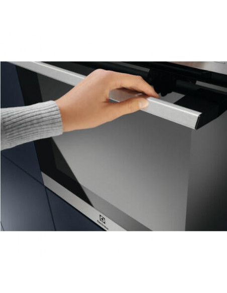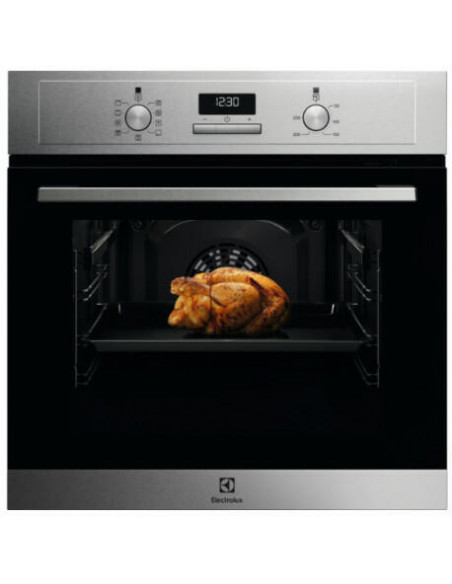 Electrolux EOF3H50BX. Tamanho do forno: Médio, Tipo de forno: Forno elétrico, Capacidade interior do(s) forno(s) totais: 65 l. Local de colocação: Embutido, Cor do produto: Aço inoxidável, Tipo de controlo: Rotativo, Toque. Tipo de temporizador: Digital, Modos do temporizador: Tempo de confeção, Temporizador. Classe de eficiência energética: A, Consumo energético (convencional): 0,89 kWh, Consumo energético (convecção forçada): 0,78 kWh. Comprimento do compartimento de instalação: 56 cm, Largura do compartimento de instalação: 55 cm, Altura do compartimento de instalação: 59,3 cm