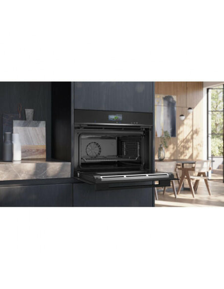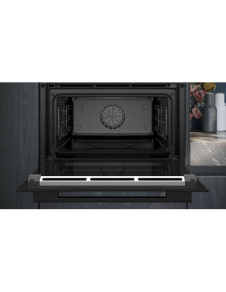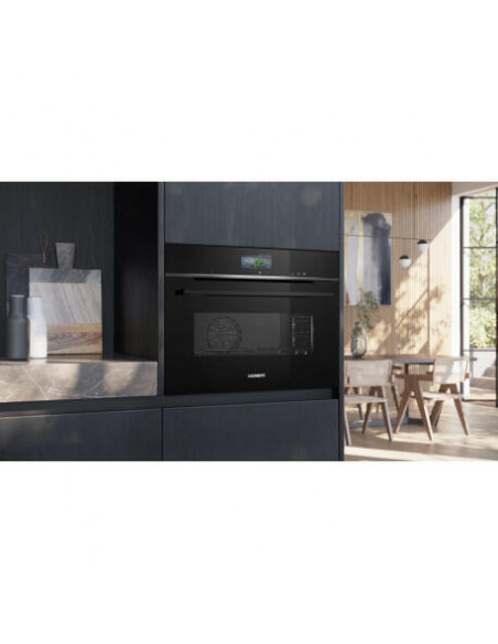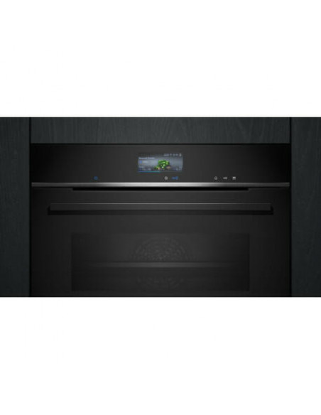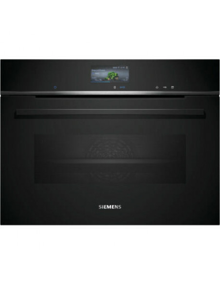 Siemens iQ700 CS736G1B1. Tamanho do forno: Médio, Tipo de forno: Forno elétrico, Capacidade interior do(s) forno(s) totais: 47 l. Local de colocação: Embutido, Cor do produto: Preto, Tipo de controlo: Toque. Tipo de relógio: Electrónico, Aplicações de controlo suportadas: Home Connect. Classe de eficiência energética: A+, Consumo energético (convencional): 0,73 kWh, Consumo energético (convecção forçada): 0,61 kWh. Tipo de lâmpada: LED