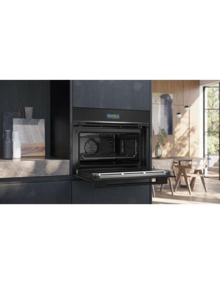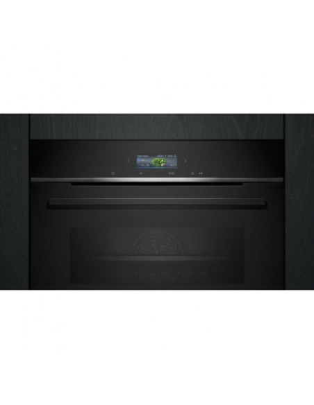 Siemens iQ700 CB774G1B1. Tamanho do forno: Médio, Tipo de forno: Forno elétrico, Capacidade interior do(s) forno(s) totais: 47 l. Local de colocação: Embutido, Cor do produto: Preto, Tipo de controlo: Toque. Tipo de relógio: Electrónico. Classe de eficiência energética: A+, Consumo energético (convencional): 0,73 kWh, Consumo energético (convecção forçada): 0,61 kWh. Quantidade de lâmpadas: 1 lâmpada(s), Tipo de lâmpada: Halogénio