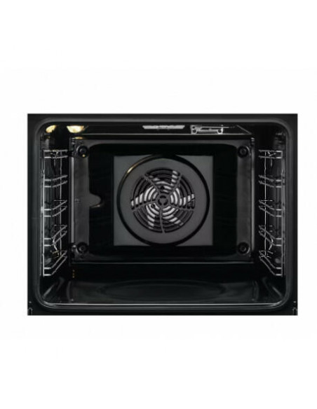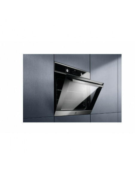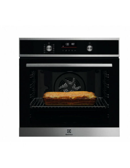 Electrolux EOF6P77X. Tamanho do forno: Médio, Tipo de forno: Forno elétrico, Capacidade interior do(s) forno(s) totais: 72 l. Local de colocação: Embutido, Cor do produto: Preto, Aço inoxidável, Tipo de controlo: Rotativo, Toque. Tipo de relógio: Electrónico, Tipo de temporizador: Digital. Classe de eficiência energética: A+, Consumo energético (convencional): 0,93 kWh, Consumo energético (convecção forçada): 0,69 kWh. Quantidade de lâmpadas: 1 lâmpada(s), Tipo de lâmpada: Halogénio, Localização de iluminação: Topo