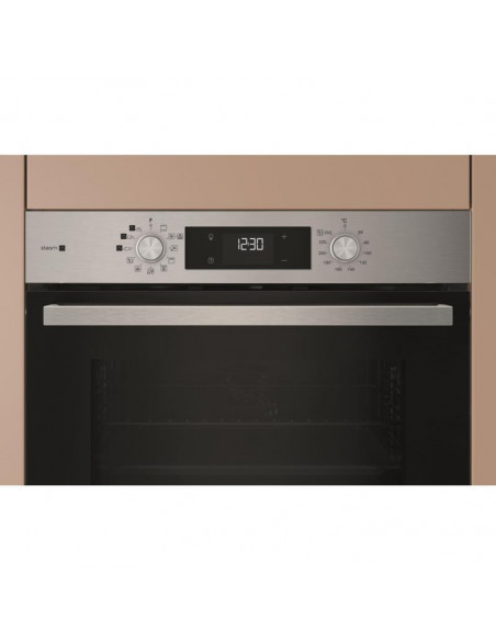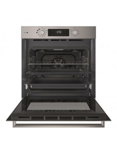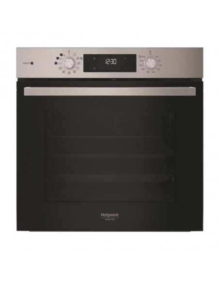 Hotpoint HAO3 K58HSU1 X. Tamanho do forno: Médio, Tipo de forno: Forno elétrico, Capacidade interior do(s) forno(s) totais: 71 l. Local de colocação: Embutido, Cor do produto: Preto, Aço inoxidável, Tipo de controlo: Rotativo. Tipo de temporizador: Digital. Classe de eficiência energética: A+, Consumo energético (convencional): 0,89 kWh, Consumo energético (convecção forçada): 0,69 kWh. Quantidade de lâmpadas: 1 lâmpada(s), Localização de iluminação: Esquerda frontal ;