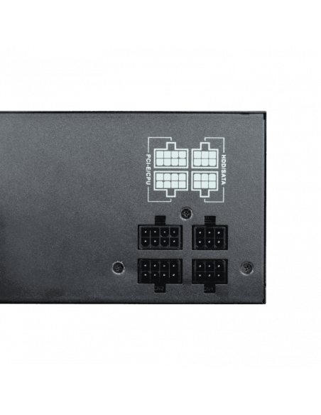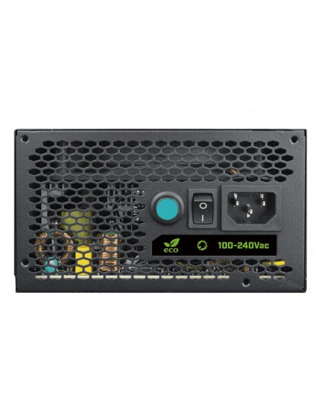 A tecnologia AirGuard otimiza a dissipação de calor, mantendo a temperatura interna sob controlo. O ventilador de 120mm com controlo inteligente de velocidade ajusta a rotação conforme a necessidade, equilibrando refrigeração e silêncio. O modo ECO permite a operação fanless em baixas cargas, eliminando o ruído e prolongando a vida útil da ventoinha.