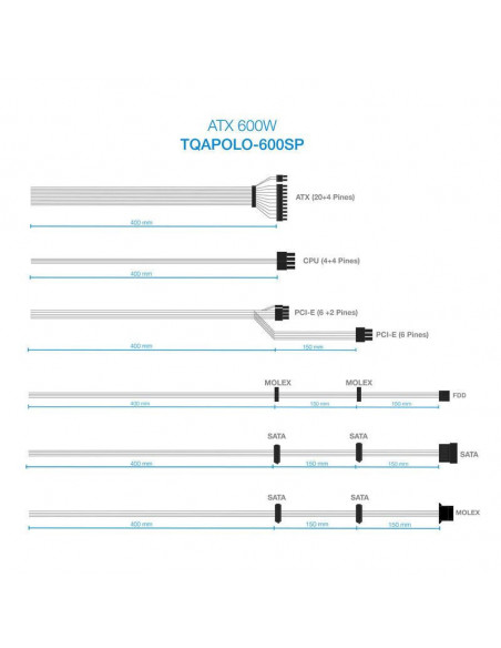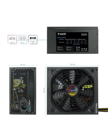 TooQ TQAPOLO-600SP. Potencia total: 600 W, Voltaje de entrada AC: 220 V, Frecuencia de entrada AC: 50/60 Hz. Alimentador de energía para tarjeta madre: 20+4 pin ATX, Longitud del cable de alimentación de la placa base: 40 cm, Longitud del cable de alimentación SATA: 700 mm. Utilizar con: PC, Factor de forma de fuente de alimentación (PSU): ATX, Formas de factor de tarjeta madre soportadas: ATX. Color del producto: Negro, Tipo de enfriamiento: Activo, Diámetro de ventilador: 14 cm. Ancho: 150 mm, Profundidad: 160 mm, Altura: 85 mm