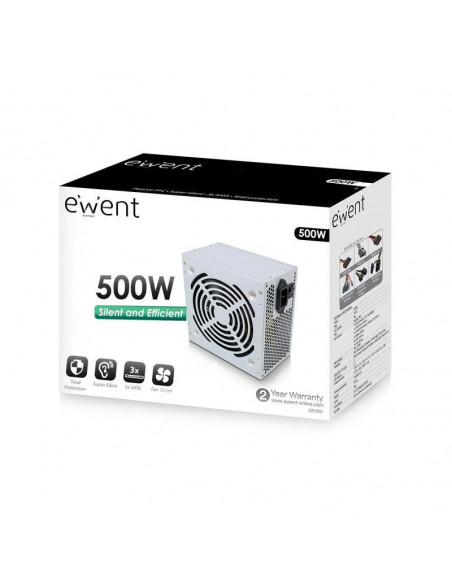 Fonte de alimentação Ewent ATX de 500W, com ventilador de 12cm e múltiplas proteções.  Ideal para computadores de média performance.