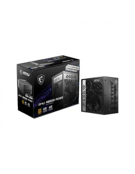 Fonte de alimentação MSI MPG A850G PCIE5 com 850W de potência, certificação 80 PLUS Gold para alta eficiência energética, design totalmente modular para maior flexibilidade na gestão de cabos, e compatibilidade com placas-mãe ATX. Inclui conectores PCI-E 5.0 e vários conectores SATA.
