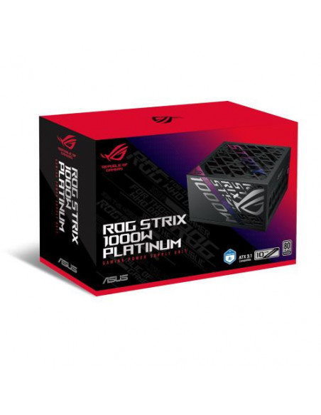 Fonte de alimentação ASUS ROG Strix 1000P-Gaming (90YE00W1-B0NA00), com potência total de 1000W e certificação 80 PLUS Platinum. É uma fonte totalmente modular, com cabos destacáveis, facilitando a instalação e gestão de cabos. Integra um ventilador de 135mm semi-passivo que permite um funcionamento silencioso.
