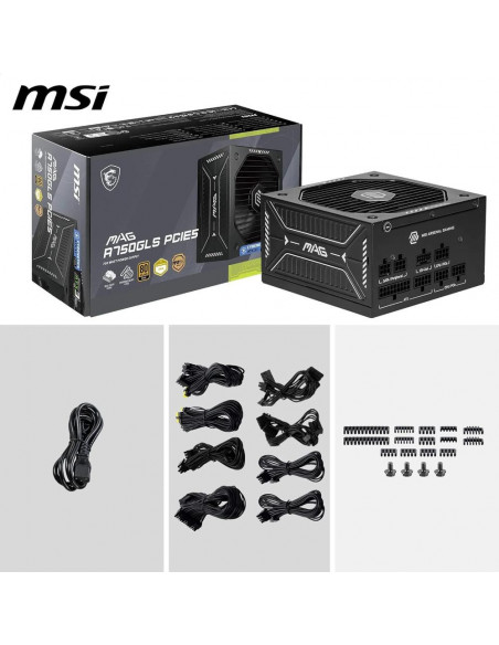 Fonte de alimentação MSI MAG A750GLS PCIE5, uma solução modular de 750W com certificação 80 PLUS Gold. Ideal para computadores de secretária, esta fonte oferece um funcionamento silencioso e eficiente, graças ao seu ventilador de 120mm e PFC activo. Inclui conectores PCI-E 5.0 (16-pin) e múltiplas ligações SATA e PCI-E.