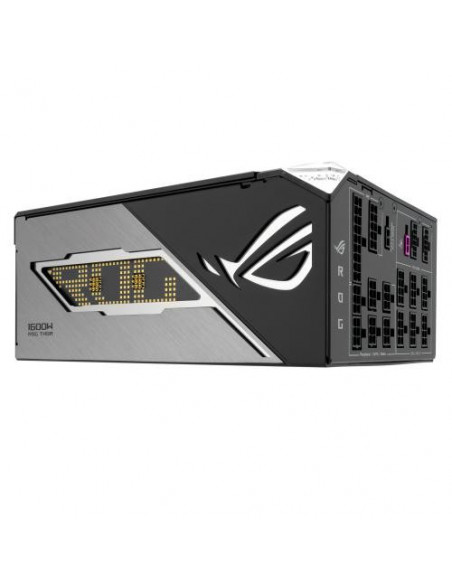 A fonte de alimentação ASUS ROG-THOR-1600T3-GAMING é uma unidade de 1600W com certificação 80 PLUS Titanium, garantindo uma elevada eficiência energética. O seu design totalmente modular permite que apenas os cabos necessários sejam utilizados, simplificando a gestão de cabos e melhorando o fluxo de ar dentro do gabinete. Integra um visor OLED que fornece informações em tempo real sobre a potência, voltagem e outros parâmetros. A refrigeração é assegurada por um ventilador ativo de alta performance, que proporciona um funcionamento silencioso mesmo sob carga máxima. A unidade é compatível com placas-mãe ATX, e inclui diversos conectores para alimentação de componentes como CPU, placas gráficas (PCIe) e periféricos (SATA e Molex). Detalhes técnicos podem ser verificados nas especificações abaixo.