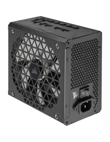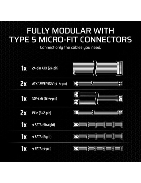 As especificações técnicas incluem conectores 24-pin ATX para a placa-mãe, conectores SATA, conectores PCI-Express (6+2 pin) para placas de vídeo e conectores periféricos (Molex). A Corsair disponibiliza informações detalhadas sobre os comprimentos dos cabos, permitindo que os utilizadores verifiquem a adequação da fonte para o seu gabinete antes da compra. O peso total da fonte é de 3,2 kg e o seu design é elegante e discreto, numa cor preta.