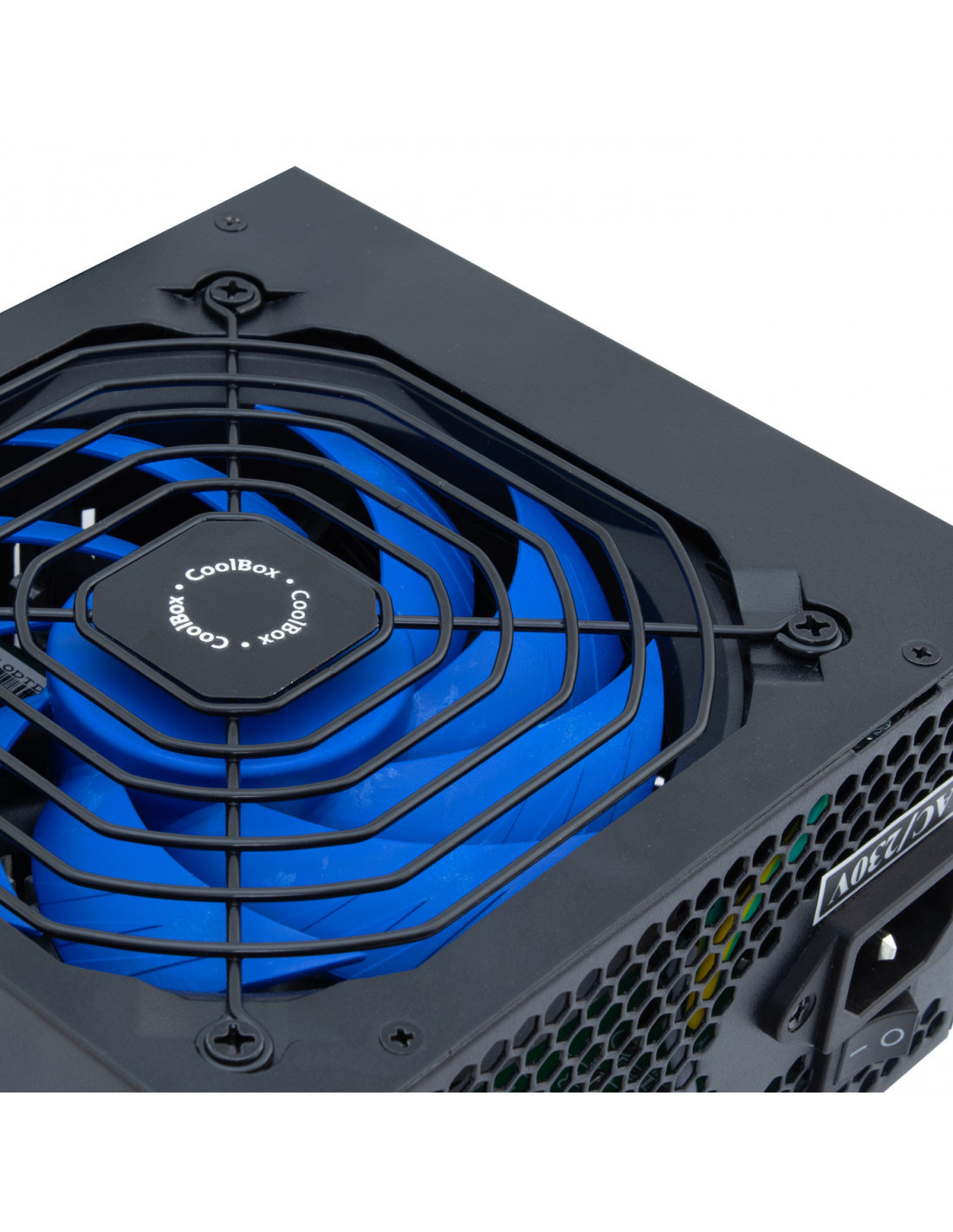 A fonte de alimentação Coolbox utiliza PFC (Power Factor Correction) ativo, otimizando a eficiência energética e reduzindo o desperdício de energia. A ventoinha de 14 cm, garante um arrefecimento eficaz e silencioso. A fonte possui diversos conectores, incluindo PCI-E para placas gráficas, SATA para discos rígidos e SSDs, e conectores para a placa-mãe e CPU.