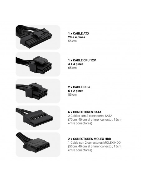 Esta fonte de alimentação possui conectores para alimentar todos os componentes do seu sistema, incluindo conectores PCI-E para placas gráficas, conectores SATA para discos rígidos e SSDs, e conectores para a placa-mãe e CPU. O design simplificado facilita a instalação.