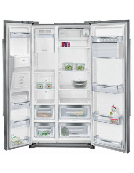 Classe de eficiência energética A++ Sistema noFrost multiAirflow Capacidade total: 533 L Tecnologia ecoLight interior LED Tecnologea de alto rendimento compressor inverter TouchControl integrado na porta Função "super refrigeração" e "super congelação" com desconexão automática Alarme acustico de porta aberta Alarme acustico de avaria e de temperatura Função de memória de temperaturas mais altas Dispensador de água, gelo em cubos e picado. Inclui filtro de água e mangueira de conexão Equipamento interior com acabado metálico Compartimento especial multiBox na porta 2 grandes gavetas para frutas e verduras Consumo de energia: 343 kWh/ano Dimensões: (A x L x P): 177 x 91 x 72