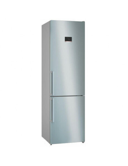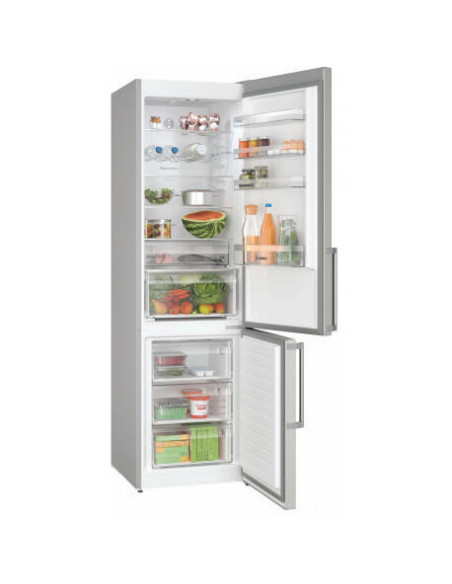 Bosch KGN397ICT. Capacidade total líquida: 363 l. Dobradiça da porta: Direita, Tipo de monitor: LED. Nível de ruído: 35 dB. Capacidade líquida do frigorífico: 260 l, Sistema no-frost (frigorífico), Sistema multi-airflow (frigorífico), Luz interior do frigorífico, Prateleiras do frigorífico: 5. Capacidade líquida do congelador: 103 l, Capacidade de congelação: 10 kg/24h, Sistema no-frost (congelador). Classe de eficiência energética: C, Consumo de energia anual: 162 kWh. Cor do produto: Aço inoxidável