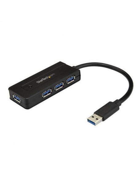Hub USB 3.0 compacto da StarTech com 4 portas, oferecendo velocidades de até 5000 Mbps. Alimentado por CA. Design compacto e cor preta. Garantia de 24 meses.
