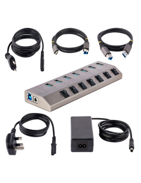 Hub USB-C StarTech de 7 portas com interruptores individuais.  Velocidade de transferência de dados de 5 Gbps.  Suporte UASP para desempenho otimizado.  Alimentado por CC (65W). Inclui adaptador de alimentação (EU e UK).  Design compacto e prático.