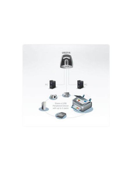 El US221A es un conmutador de 2 puertos para dispositivos periféricos USB 2.0 que permite que hasta 2 ordenadores compartan el mismo dispositivo USB (por ejemplo una impresora, un escáner, un dispositivo de almacenamiento masivo etc.). Mientras un ordenador tenga acceso al dispositivo periférico, el otro no lo tendrá.