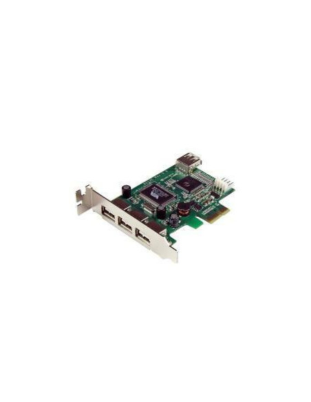Adaptador Startech que adiciona 4 portas USB 2.0 ao seu computador através de uma interface PCI Express. Oferece 3 portas USB externas e 1 interna, com velocidades de até 480 Mbps. Ideal para expandir a conectividade USB do seu PC.