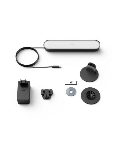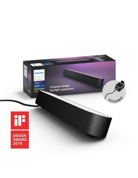 Philips Hue White and colour ambience Pack individual barra de luces Play. Tipo: Panel inteligente, Color del producto: Negro, Tipo de bombilla: LED integrado. Alimentación: Corriente alterna, Voltaje de entrada AC: 100 - 240 V, Frecuencia de entrada AC: 50 - 60 Hz. Ancho: 44 mm, Profundidad: 253 mm, Altura: 36 mm. Tipo de embalaje: Caja, Ancho del paquete: 102 mm, Profundidad del paquete: 298 mm. Cantidad por paquete: 1 pieza(s), Vatios de la bombilla incluida: 6,6 W