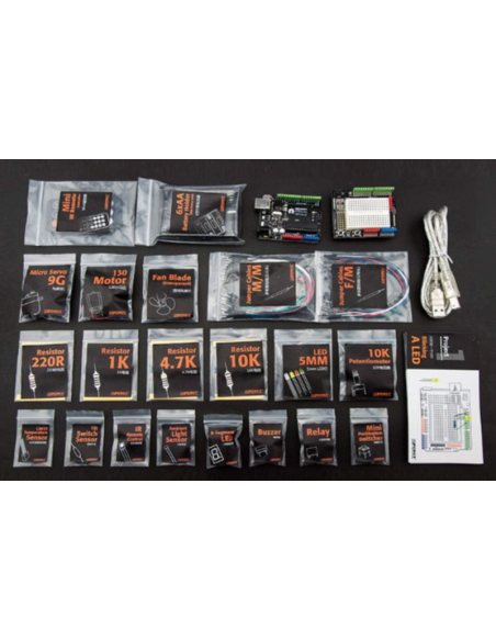 O kit inclui uma variedade de componentes eletrónicos organizados em sacos individuais, para facilitar a sua identificação e utilização. Entre os componentes encontram-se LEDs, resistores, fios jumper de alta qualidade (firmes, grossos e resistentes a quebras), uma placa de prototipagem, e outros componentes necessários para a construção dos projetos. A diferenciação das portas por cores facilita a ligação dos componentes. Um diagrama de fiação claro e acessível acompanha o kit, simplificando a construção dos projetos.
