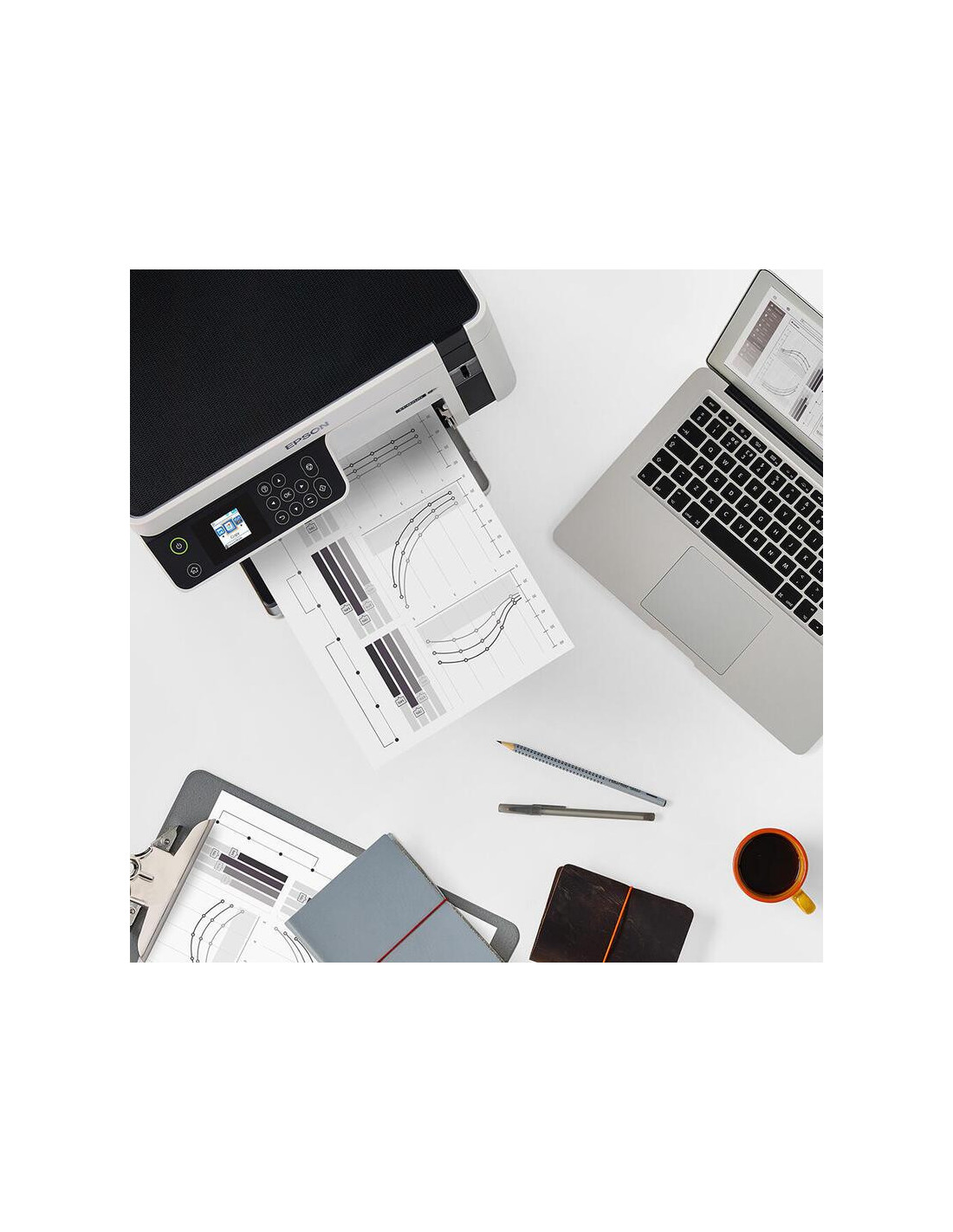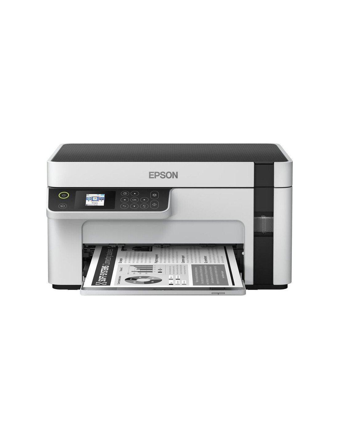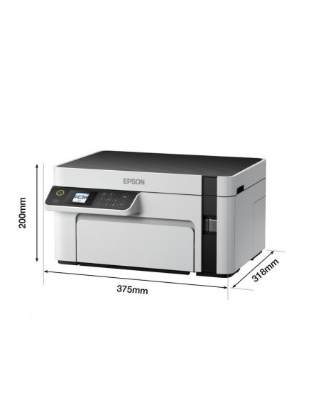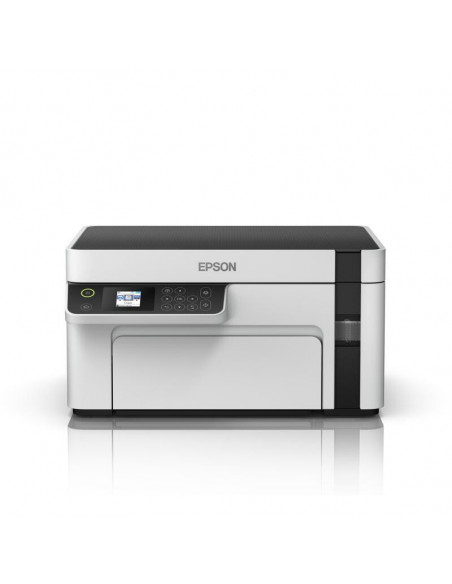 Impressora multifuncional Epson EcoTank ET-M2120 monocromática para impressão, cópia e digitalização de documentos A4. Tecnologia de jato de tinta, resolução máxima de 1440 x 720 DPI para impressão e 2400 x 1200 DPI para digitalização. Conectividade Wi-Fi e impressão directa.  Design em preto e branco.
