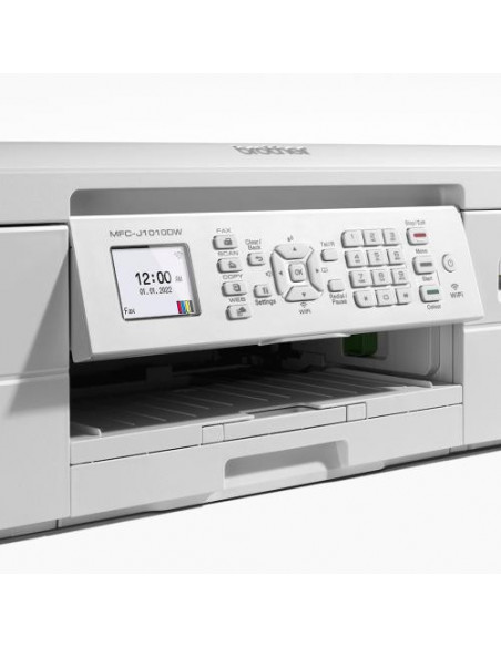 A Brother MFC-J1010DW é uma impressora multifuncional que combina impressão, cópia e digitalização a cores num único dispositivo. Utiliza tecnologia de impressão a jacto de tinta, atingindo uma resolução máxima de 1200 x 6000 DPI. A impressora suporta impressão dúplex (frente e verso) automaticamente, permitindo poupar papel e custos. A velocidade de impressão a preto é de 17 ppm em qualidade normal, enquanto a cópia a preto é de 11,5 cpm. As funções de cópia e digitalização também são a cores, com resolução máxima de 1200 x 1200 DPI na cópia e 1200 x 2400 DPI na digitalização. Inclui um alimentador automático de documentos (ADF) com capacidade para 20 folhas. A conectividade é garantida pela interface Wi-Fi, permitindo uma ligação sem fios a computadores, smartphones e tablets.  É compatível com Apple AirPrint, Brother iPrint&Scan e Google Cloud Print. A impressora possui uma bandeja principal para 150 folhas e uma bandeja multiusos para 20 folhas adicionais, com suporte para diversos tipos de papel. A dimensão da impressora é 400 x 343 x 172 mm e o peso é de 8,1 kg.  O ecrã LCD de 6,78 polegadas facilita a navegação entre as funções e configurações.  A impressora vem com cartuchos de tinta incluídos e é compatível com vários sistemas operativos, incluindo Windows, macOS e Linux. Informações sobre especificações detalhadas de software, memória interna, etc estão disponíveis na documentação do fabricante.