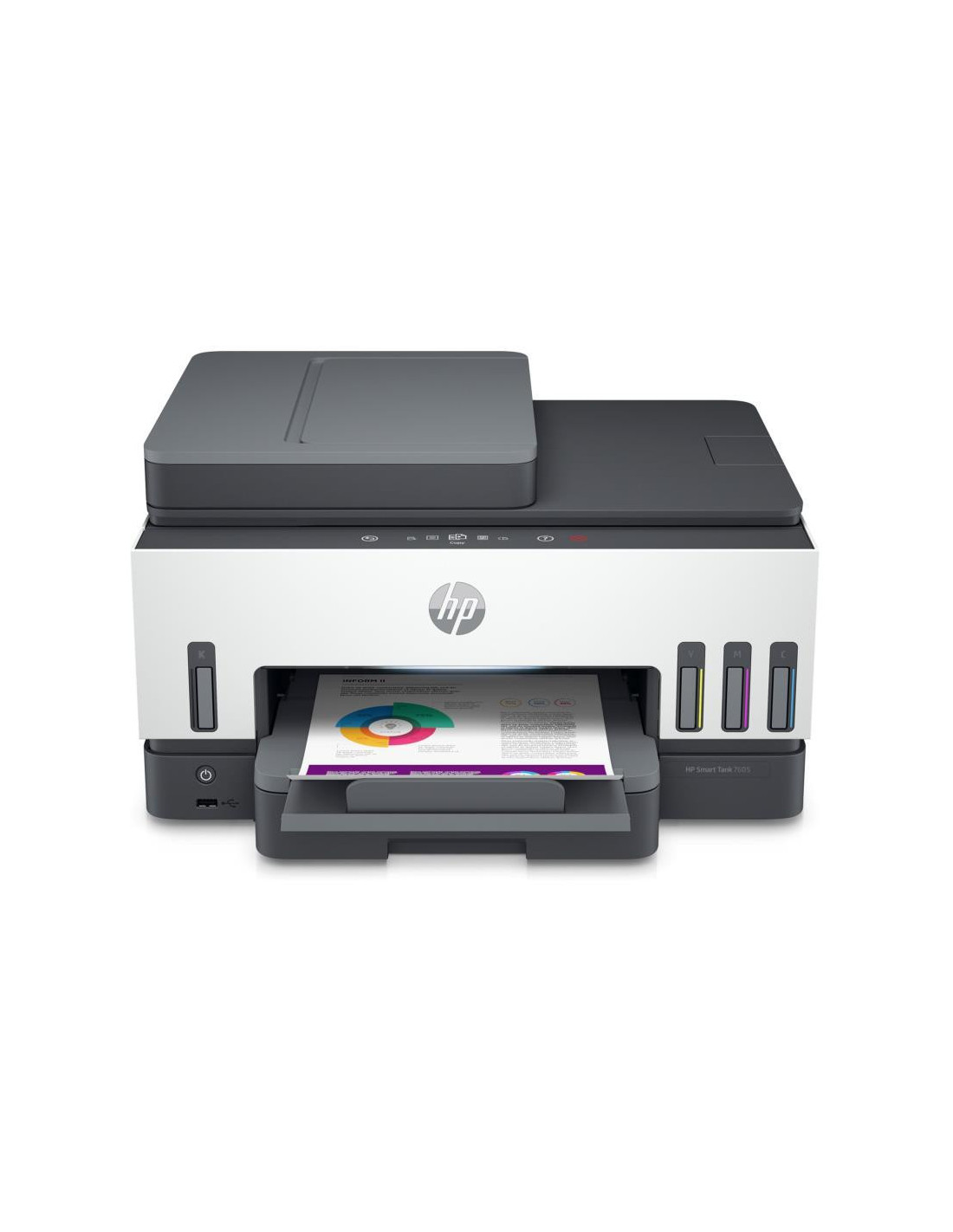 HP Smart Tank Multifunções 7605, Cor, Impressora para Casa e escritório em casa, Impressão, cópia, digitalização, fax, ADF e ligação sem fios, ADF para 35 folhas; Digitalização para PDF; Impressão frente e verso. Tecnologia de impressão: Jato de tinta térmico, Impressão: Impressão a cores, Resolução Máxima: 4800 x 1200 DPI, Velocidade de impressão (cores, qualidade normal, A4/US Letter): 9 ppm. Cópia: Cópia a cores, Resolução de cópia máxima: 600 x 600 DPI. Digitalização: Digitalização a cores, Resolução óptica de digitalização: 1200 x 1200 DPI. Envio de fax: Fax a cores. Funções duplex: Fax. Dimensão máxima de papel ISO A-series: A4. Wi-Fi. Impressão directa. Cor do produto: Cinzento ;