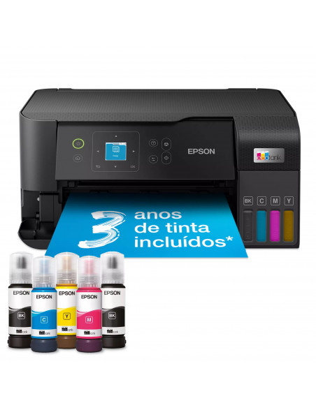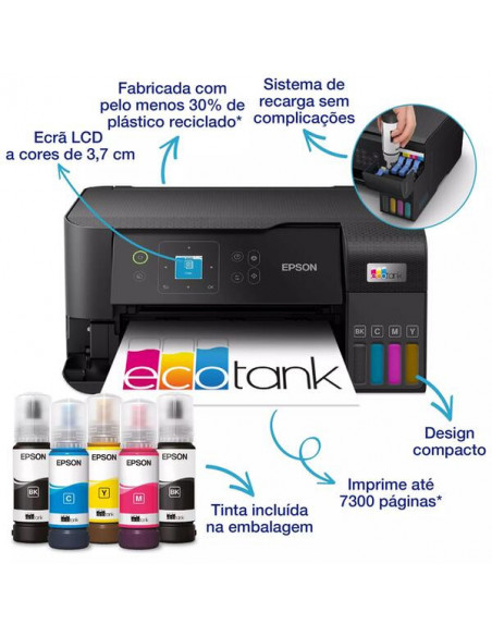 A Epson EcoTank ET-2840 é uma impressora multifunções a jato de tinta, ideal para utilização em casa e em pequenos escritórios. Este equipamento combina as funções de impressão, cópia e digitalização, oferecendo uma solução completa para as suas necessidades de documentação. A tecnologia de impressão a jato de tinta assegura impressões vibrantes e de alta qualidade, adequadas para documentos e fotografias.
