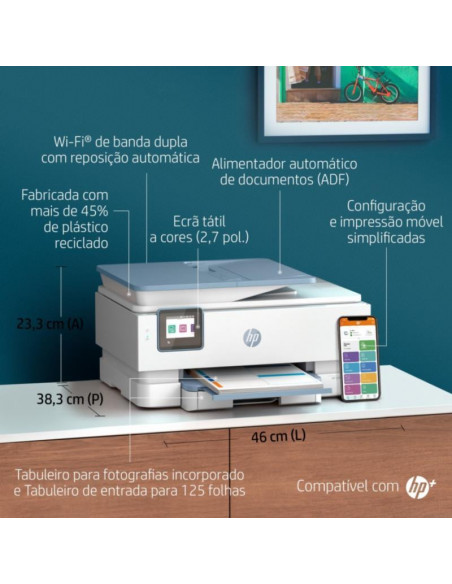 HP ENVY Multifunções Inspire 7921e, Particulares, Impressão, cópia, digitalização, Ligação sem fios; +; Elegível para Instant Ink; Alimentador automático de documentos; Impressão frente e verso. Tecnologia de impressão: Jato de tinta térmico, Impressão: Impressão a cores, Resolução Máxima: 4800 x 1200 DPI, Velocidade de impressão (cores, qualidade normal, A4/US Letter): 10 ppm. Cópia: Cópia a cores, Resolução de cópia máxima: 600 x 600 DPI. Digitalização: Digitalização a cores, Resolução óptica de digitalização: 1200 x 1200 DPI. Funções duplex: Impressão. Dimensão máxima de papel ISO A-series: A4. Wi-Fi. Impressão directa. Cor do produto: Azul, Branco ;