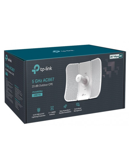 O Access Point TP-Link CPE710 é projetado para fornecer uma solução de rede sem fios de alto desempenho em ambientes exteriores. Operando na banda de frequência de 5 GHz e em conformidade com o padrão 802.11ac, este dispositivo oferece velocidades de transferência de dados rápidas e uma ligação estável, ideal para aplicações que exigem uma forte conetividade sem fios a longas distâncias.