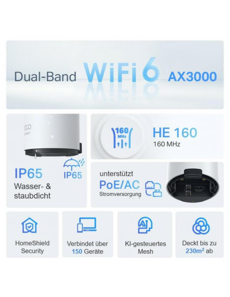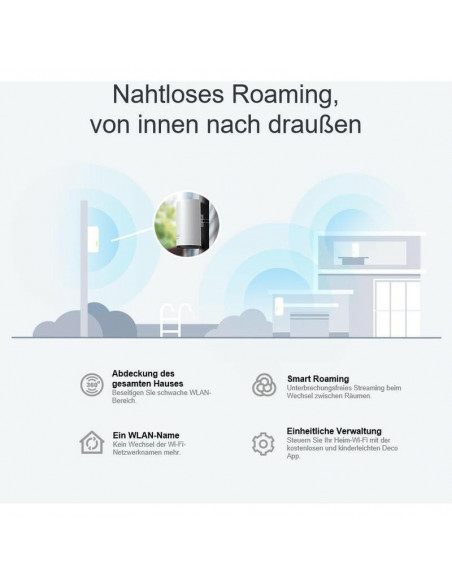Com um design exterior resistente a intempéries, o Deco X50 Outdoor é ideal para uso em jardins, pátios e outras áreas exteriores. A sua construção robusta garante que a unidade funcione de forma confiável em condições climáticas adversas. O alcance da cobertura Wi-Fi é impressionante, alcançando até 230 m², assegurando que todos os seus dispositivos se mantenham conectados, independentemente da sua localização.