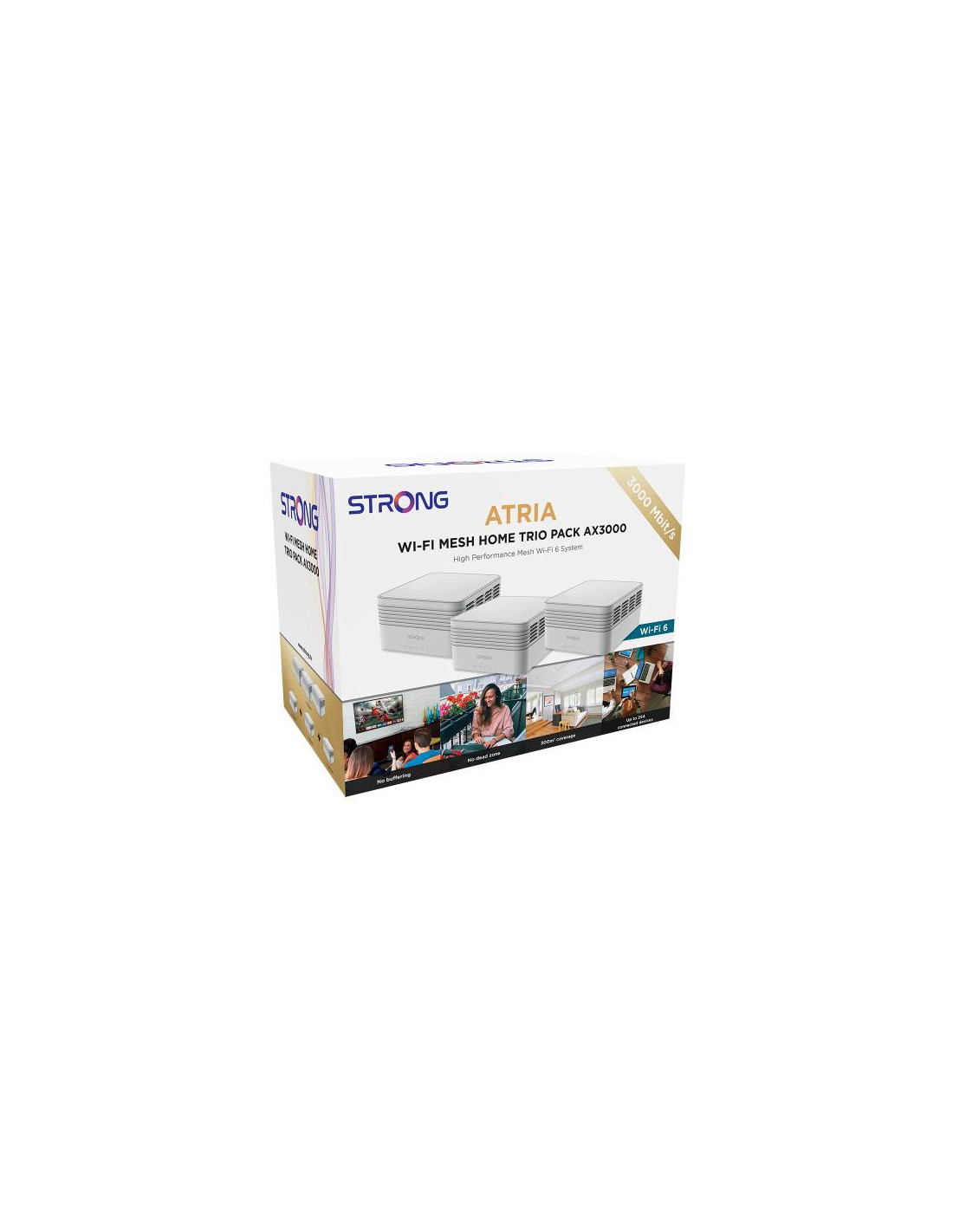 Cada unidade tem dimensões de 128 mm (largura) x 128 mm (profundidade) x 73 mm (altura) e pesa 320 g. A alimentação é feita através de um adaptador AC (12V, 1A) incluído. O sistema suporta uma cobertura máxima de 525 m² e a potência de transmissão é de 20 dBmW. O sistema Strong MESHTRIAX3000 cumpre com os certificados CE.