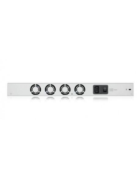 * **Físico:** Dimensões (AxLxP): 44 x 430 x 250 mm; Peso: 3,3kg; 4 ventoinhas para arrefecimento; Nível de ruído: 25,3 dB. Dissipação de calor: 120,1 BTU/h.