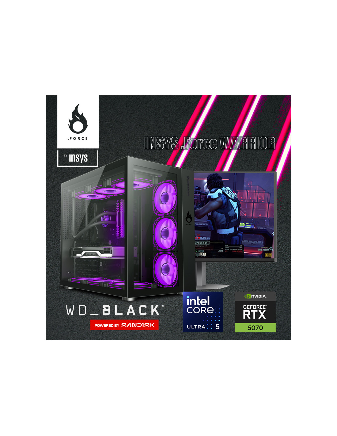 Desktop INSYS .Force WARRIOR ULTRA 5 - RTX5070 12GB, 32GB RAM, 1TB SSD, Wi-Fi 6E