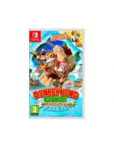 Jogo Donkey Kong Tropical Freeze para Nintendo Switch.  Nesta aventura, controla os Kongs numa emocionante corrida para salvar a Ilha do Donkey Kong dos invasores. Explora seis ilhas tropicais cheias de ação, usando os movimentos únicos de cada personagem para superar desafios. O jogo oferece modos de dificuldade diferentes, incluindo o modo original e o modo Funky, mais acessível. Pode ser jogado solo ou em modo cooperativo para dois jogadores.