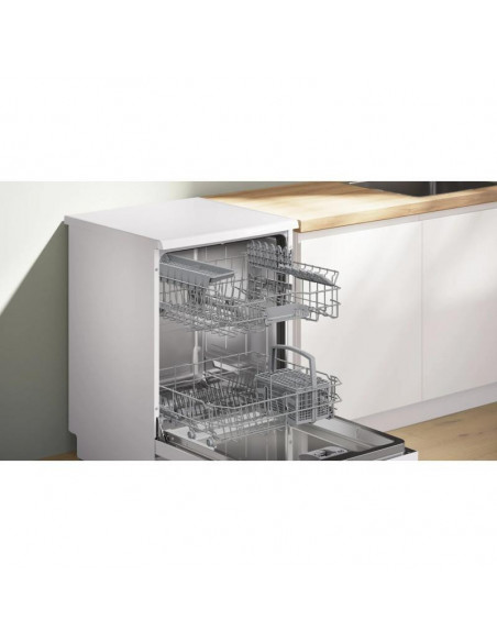 Bosch Serie 4 SMS4HKW07E. Local de colocação: Independente, Tamanho do produto: Tamanho completo (60 cm), Cor da porta: Branco. Número de talheres: 13 talheres, Classe de emissão de ruído: B, Nível de ruído: 42 dB. Classe de eficiência energética: D, Consumo de água por ciclo: 9 l, Consumo de energia por 100 ciclos: 84 kWh. Largura: 600 mm, Profundidade: 600 mm, Altura: 845 mm. Peso da embalagem: 48,3 kg ;