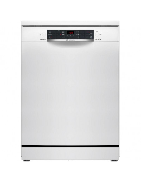 Bosch Serie 4 SMS46KW02E. Local de colocação: Independente, Tamanho do produto: Tamanho completo (60 cm), Cor da porta: Branco. Número de talheres: 13 talheres, Classe de emissão de ruído: C, Nível de ruído: 46 dB. Classe de eficiência energética: E, Consumo de água por ciclo: 9,5 l, Consumo de energia por 100 ciclos: 94 kWh. Largura: 600 mm, Profundidade: 600 mm, Altura: 850 mm. Tecnologias Bosch (lavagem de loiça): Rackmatic®, TimeLight, VarioDrawer ;
