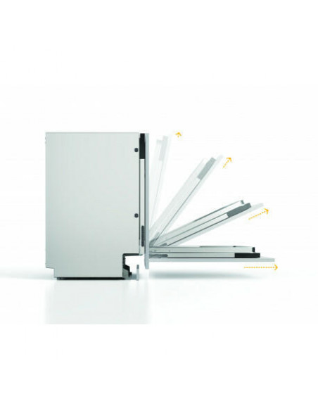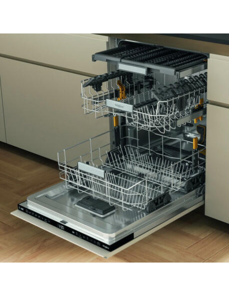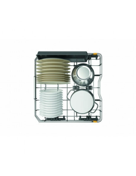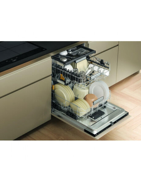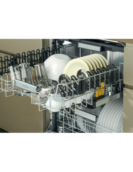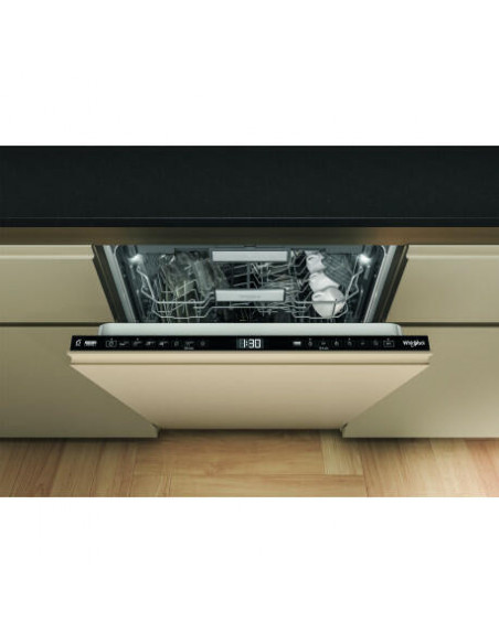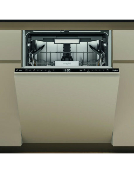 Whirlpool W7I HF60 TUS. Local de colocação: Completamente embutido, Tamanho do produto: Tamanho completo (60 cm), Cor do painel de controlo: Preto. Número de lugares: 15 espaços, Classe de emissão de ruído: B, Nível de ruído: 40 dB. Classe de eficiência energética: A, Consumo de água por ciclo: 9,5 l, Consumo de energia por 100 ciclos: 55 kWh. Largura: 598 mm, Profundidade: 555 mm, Altura: 820 mm