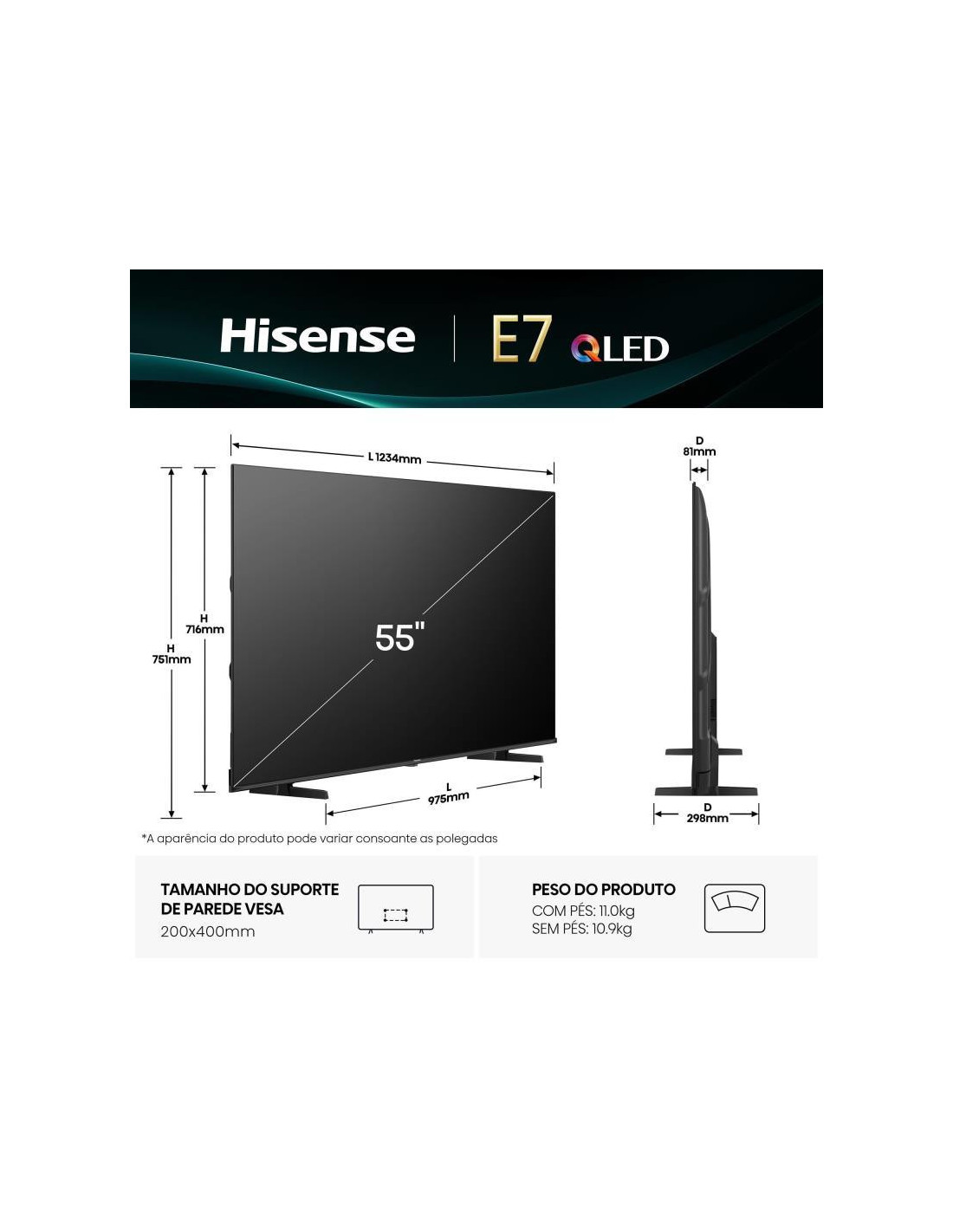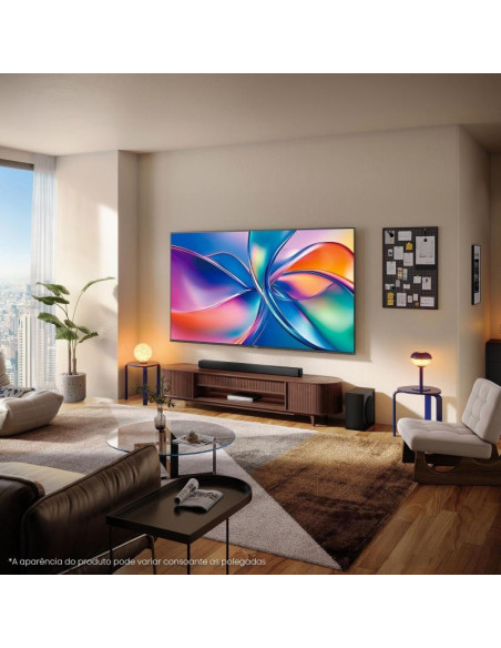 Televisor Hisense 55E7Q com ecrã QLED de 55 polegadas (139,7 cm) e resolução 4K Ultra HD (3840 x 2160 pixels). Integra funcionalidades Smart TV e suporta diversos padrões de televisão digital (DVB-C, DVB-S, DVB-S2, DVB-T, DVB-T2). Oferece conectividade Wi-Fi e Ethernet.