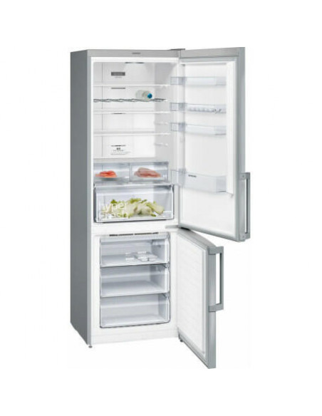 Siemens iQ300 KG49NXIDQ. Capacidade total líquida: 438 l. Dobradiça da porta: Direita. Classe climática: SN-T, Nível de ruído: 36 dB. Capacidade líquida do frigorífico: 330 l, Sistema multi-airflow (frigorífico), Luz interior do frigorífico, Prateleiras do frigorífico: 5. Capacidade líquida do congelador: 108 l, Sistema no-frost (congelador). Compartimento de zona fresca. Classe de eficiência energética: D, Consumo de energia anual: 207 kWh. Cor do produto: Aço inoxidável.