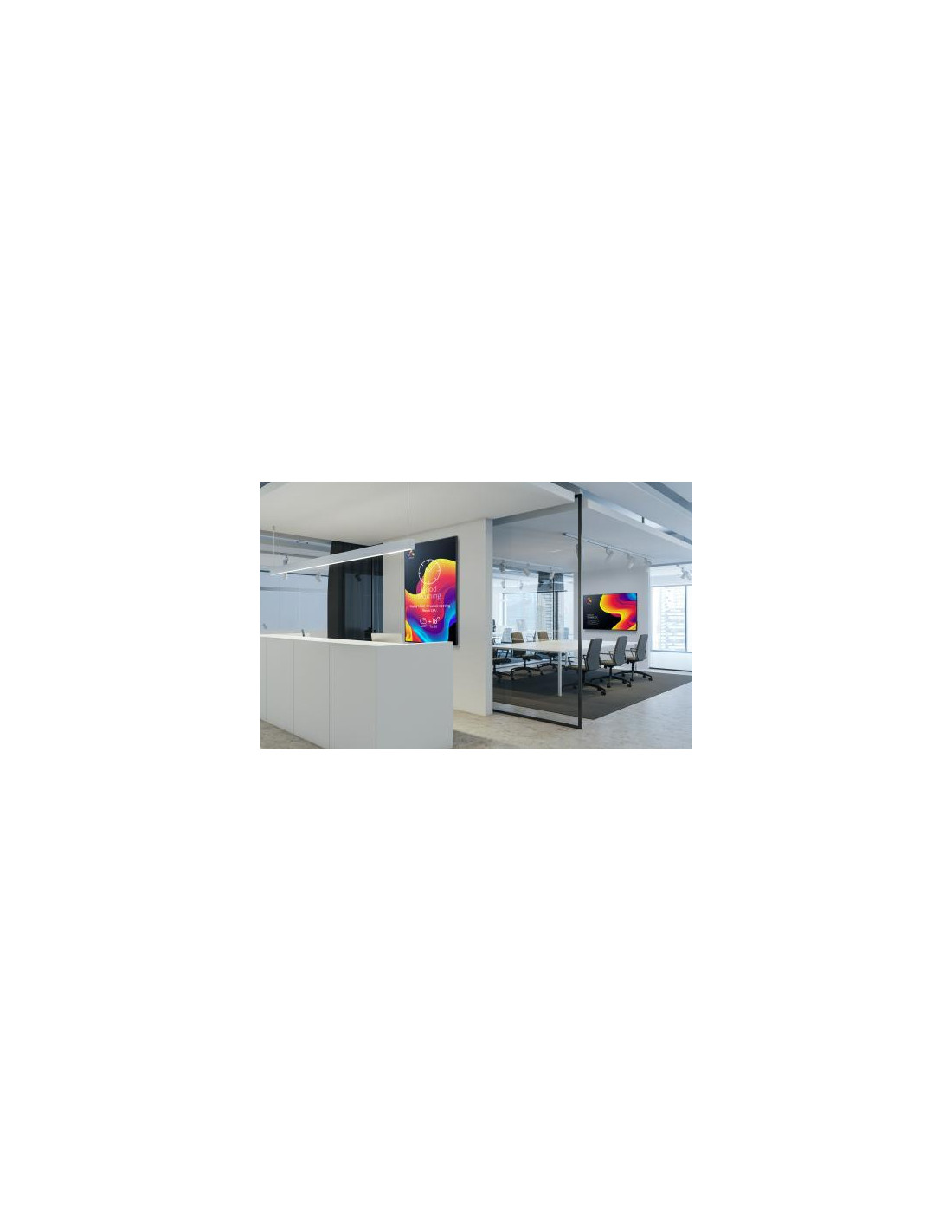 Em termos de conectividade, o ecrã oferece três entradas HDMI, permitindo conectar diversos dispositivos de reprodução. Inclui também três portas USB 2.0, ideais para a reprodução de conteúdos locais ou para a ligação de outros periféricos. Para aplicações em redes mais complexas, a conectividade Ethernet e RS-232 possibilita integração com outros sistemas de controlo e gestão. O ecrã também inclui altifalantes integrados com uma potência de 20W RMS, eliminando a necessidade de sistemas de som externos para a reprodução de áudio. A sua construção robusta, certificada para funcionamento 18/7 (18 horas por dia, 7 dias por semana) garante fiabilidade a longo prazo. Este ecrã tem dimensões de 1686 x 964 x 68 mm e pesa 34,3 kg. O consumo de energia é de 132 W. O produto inclui um comando remoto e cabo de alimentação.
