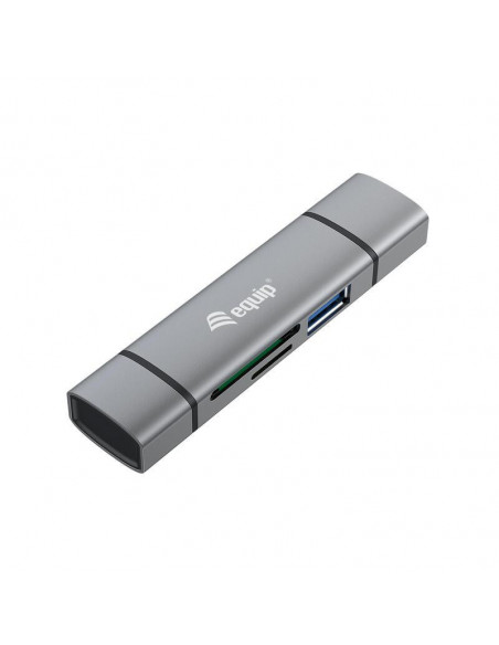 Leitor de cartões externo EQUIP com conectores USB-A e USB-C, compatível com cartões SD/MicroSD até 2TB. Design em alumínio, Plug and Play.